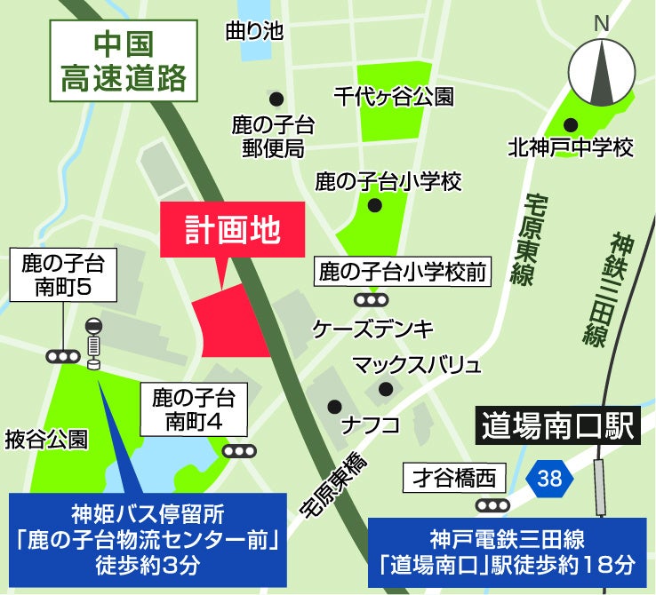 SANKEILOGIブランドとして兵庫県初進出となる本物件は、神戸電鉄三田線「道場南口駅」から徒歩圏、JR三田駅からもバス便(約14分)があるなど通勤利便性が高い立地で、周辺では物流倉庫や神戸三田プレミアムアウトレットなど、雇用事例も多数あるエリアです。