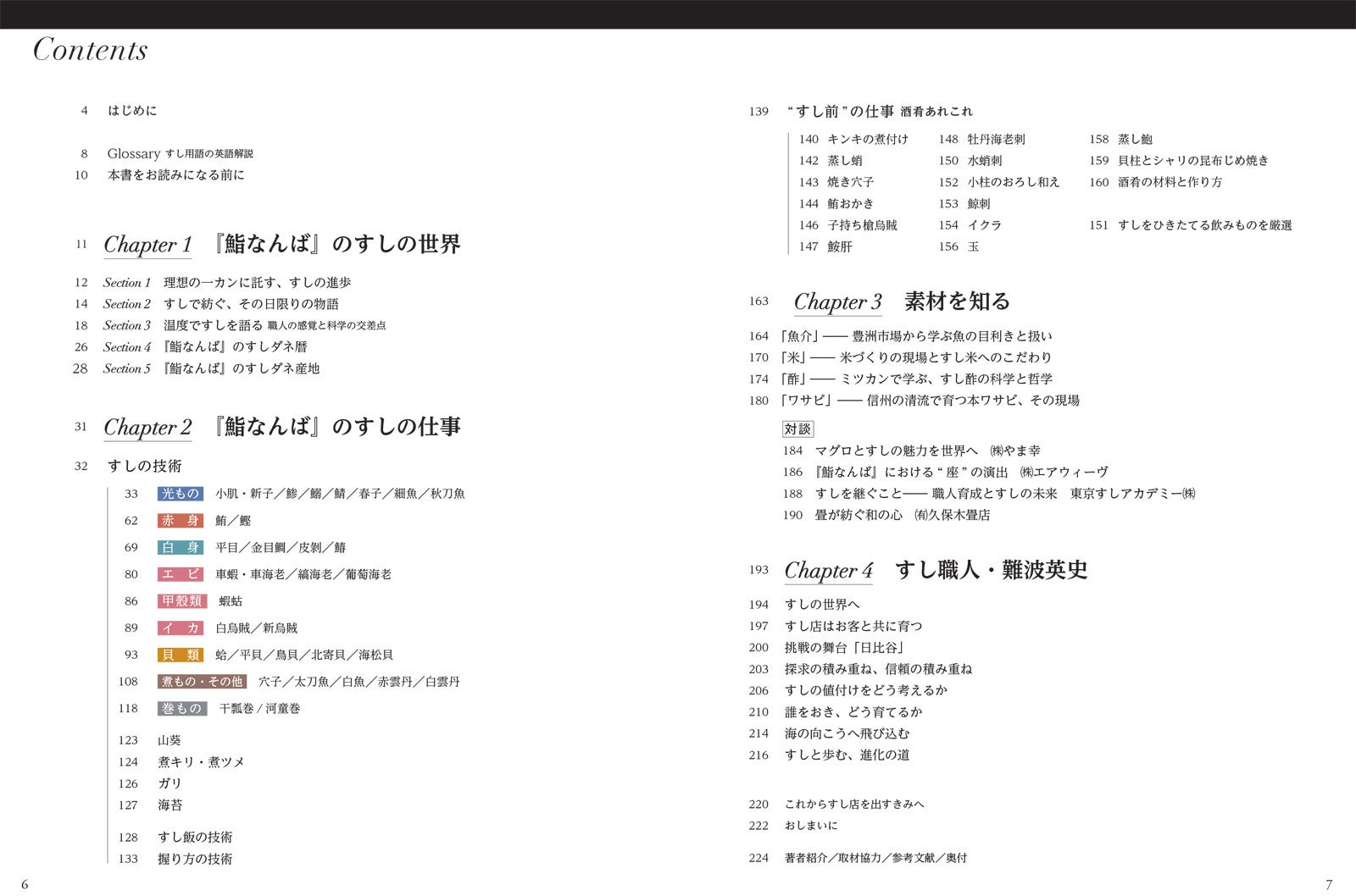 本書では、難波氏の代名詞である「温度に基づいた握りの最適化」を中心に、すしダネの仕込み、握りの技術、酒肴、コース構成、素材の選び方まで、現代の職人に必要な理論と実務を幅広く紹介しています。