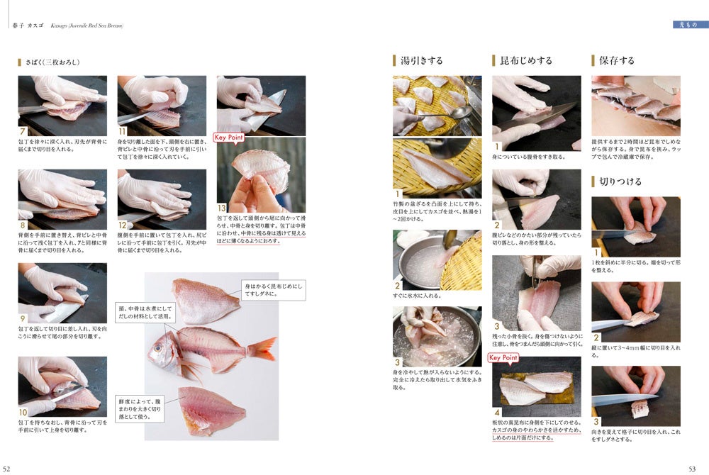 2章ではすしダネの仕込みを豊富な手順写真と共に解説。難波氏が重視・効率化する点など、実践的な手法を伝授する