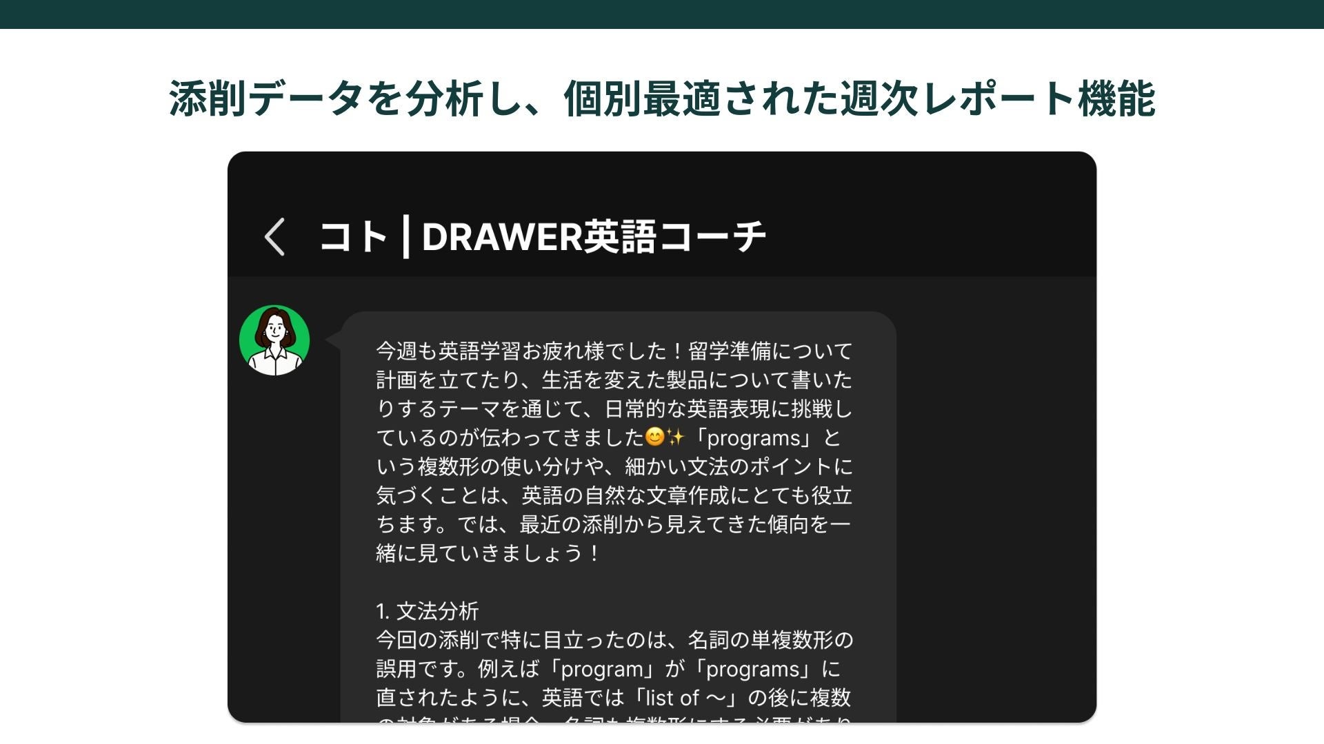 文法・語彙・表現のパターンをAIが自動分析し、改善提案まで行う週次レポート機能も搭載。