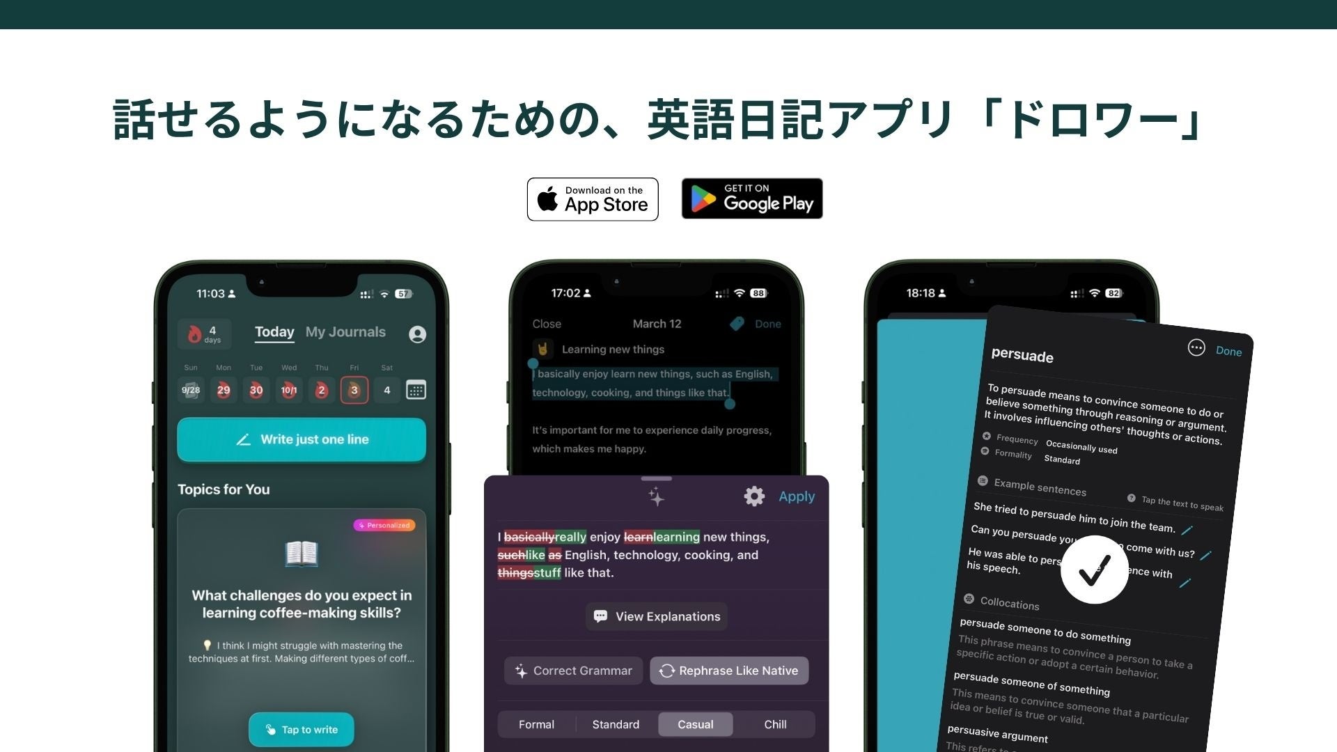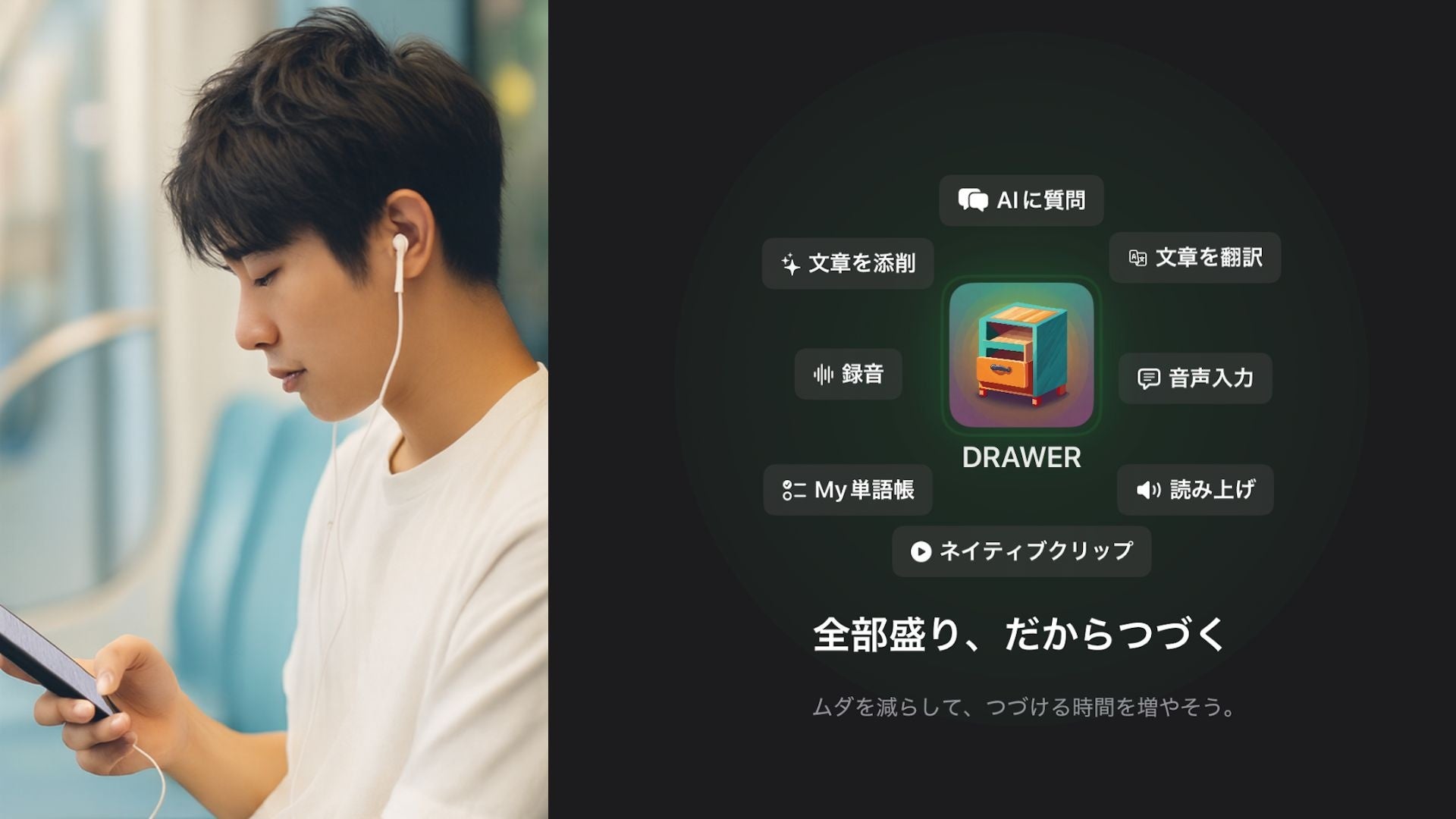 ドロワーは、「英語を、日常とつなげる」をコンセプトにしたAI英語学習アプリです。日記や自分の思考を英語で書くことで “自分専用の英語” を蓄積・可視化し、AIが最適なフィードバックを提供します。