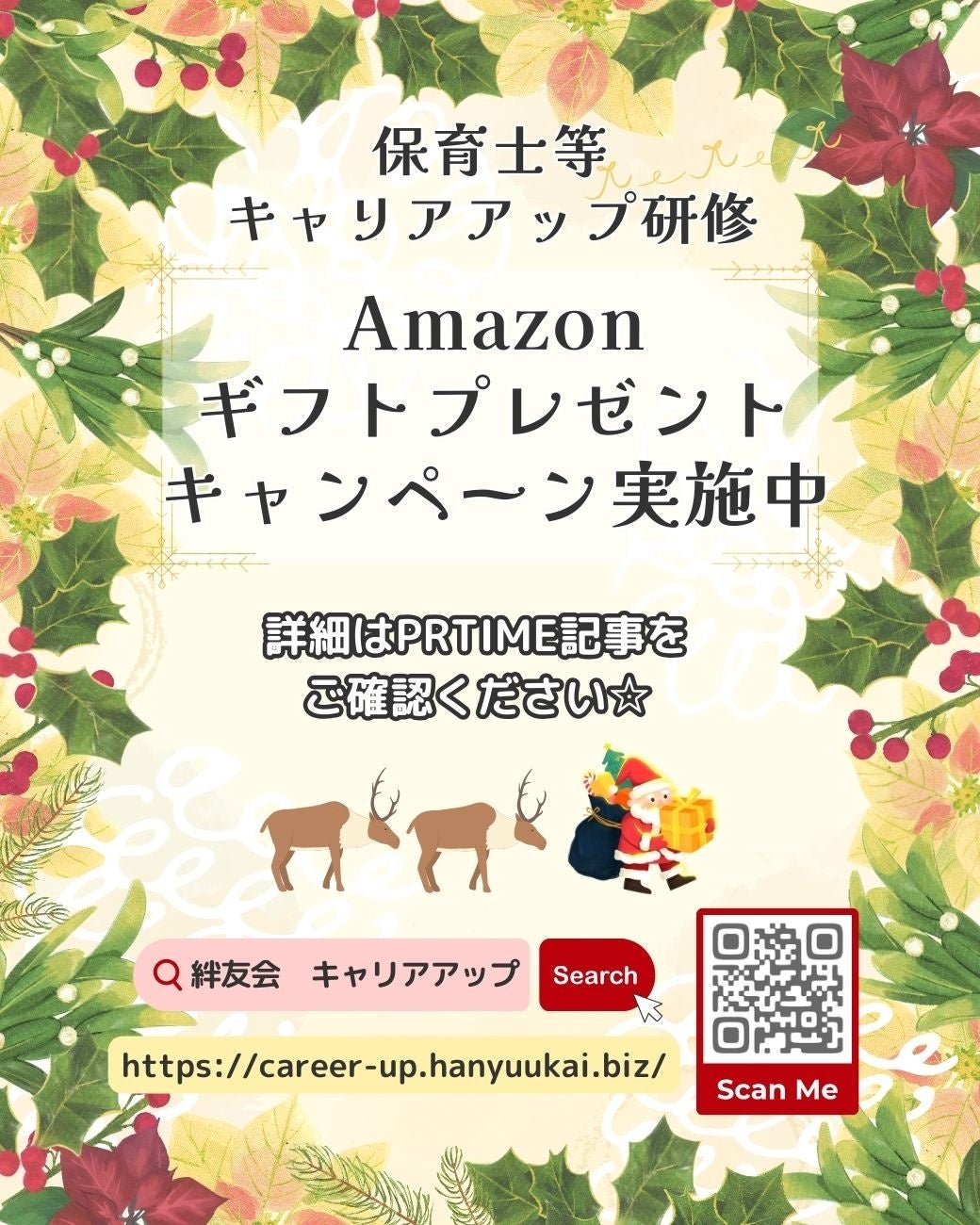 ~ 2025年のご愛顧に感謝して「ありがとうキャンペーン」実施中 ~全国向け(都外)のキャリアアップ研修について、同一園様から複数名でお申込みいただくと Amazonギフトを進呈する特別キャンペーン を開催しています。