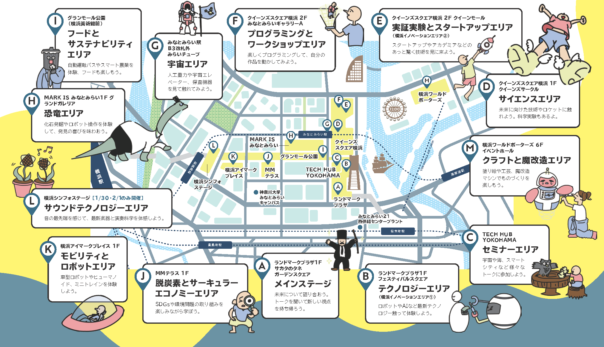(3)内容:「横浜でみらい体験」をテーマに、横浜未来機構の会員をはじめとする企業・スタートアップ・アカデミア・個人といった多彩なイノベーター・クリエイターが一堂に会し、最先端技術や実証実験中のアイデア・ソリューションを出展・発表し、研究開発を促進する、横浜未来機構主催のイベント
