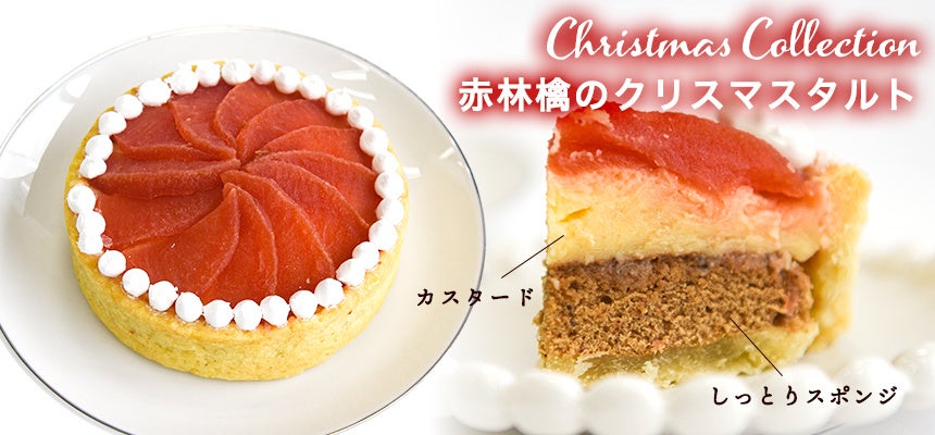 赤く色づけたスライス林檎を贅沢にあしらった冬季限定のオリジナルケーキ。ふんわりとした生クリームの下には、なめらかなカスタードと、しっとりとしたスポンジ、香ばしいタルト生地を重ね、食感と味わいのハーモニーを楽しめます。ご褒美やギフトにぴったりのクリスマスを華やかに彩る季節限定のケーキです。(内容量:190g、サイズ:直径約9.5cm×高さ約2.5cm、価格:2,200円(税込)、原産国名:日本)