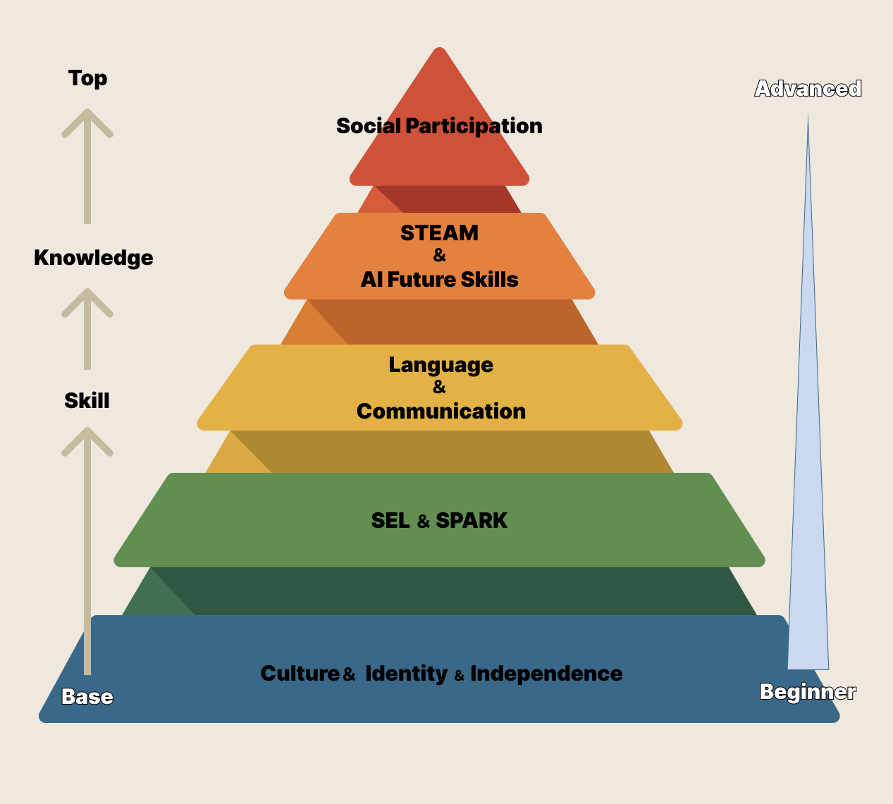 この時期には、挑戦する姿勢、集中力、感情の扱い方、協働性など、 “自分らしさ”を形づくる非認知能力が大きく育ちます。ウィズダムアカデミーでは、この大切な時期を「ブースター(導入)教育」と位置づけ、 成長段階に合わせて育まれるべき力を体系化しています。未就学児には「自分らしさの基盤」を、就学児には「人間力の育ち」を、高学年には未来につながる具体的なスキルを、そしてその先には“社会で活きる実践力”へと発展していく、連続性のある教育ステップを提供しています。