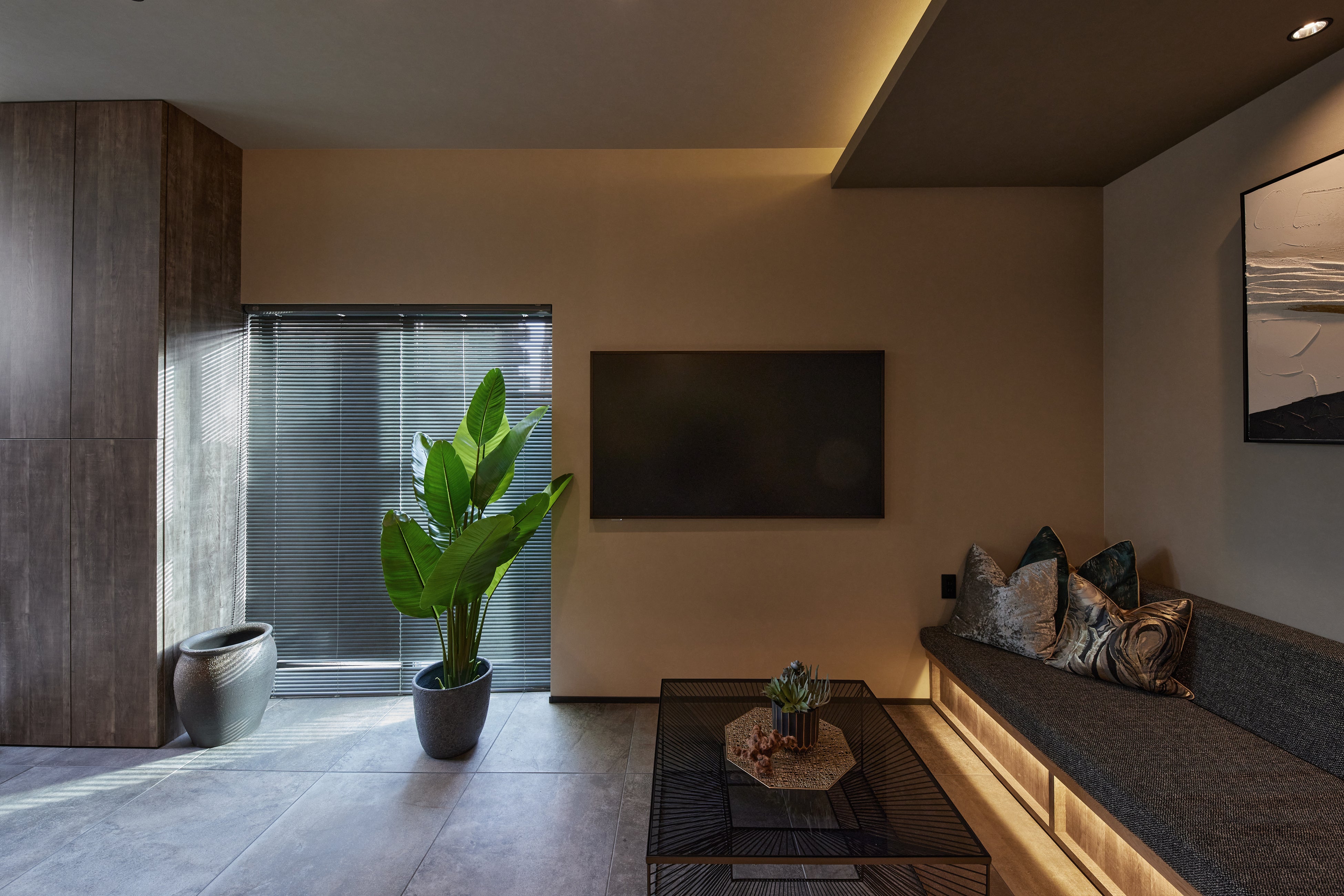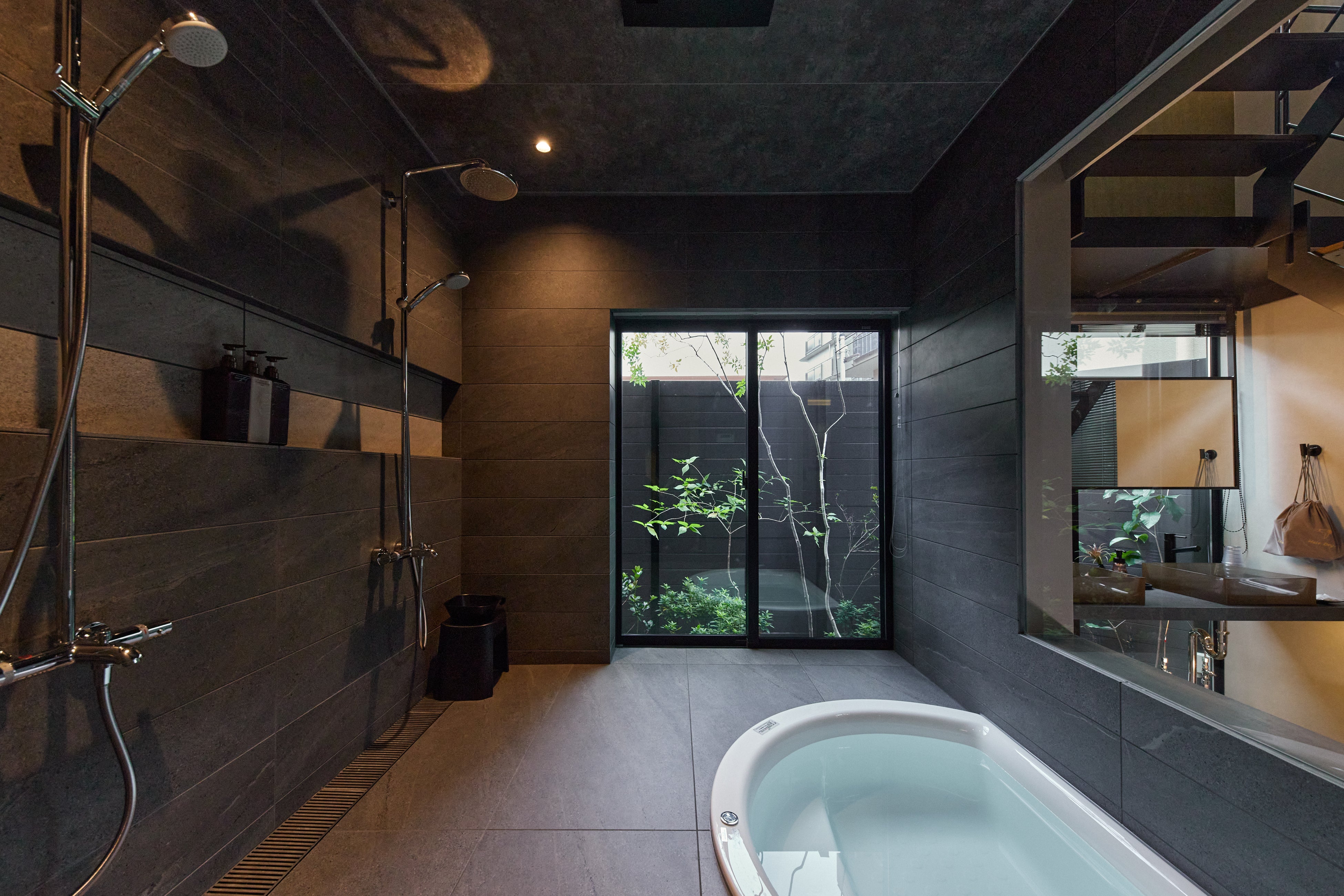 リビング横には、埋め込み型のバスタブを備えたバスエリア。半円状のデザインが空間に柔らかさを添え、ゆったりとした入浴時間を演出します。シャワーは2台設置されており、グループ滞在でも快適に利用可能です。