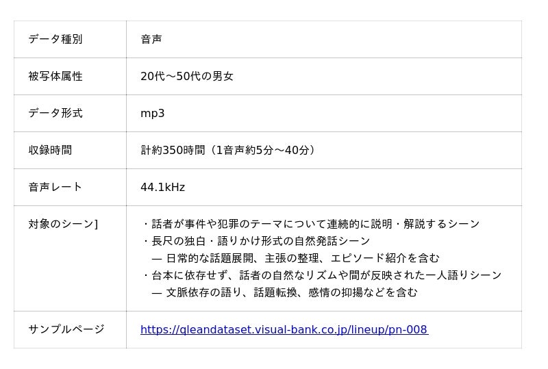 Visual Bank株式会社(東京都港区、代表取締役CEO 永井真之、以下「Visual Bank」)は、傘下の株式会社アマナイメージズを通じて展開するAI学習用データソリューション『Qlean Dataset(キュリンデータセット)』において、『日本語・1話者・事件犯罪テーマトーク音声コーパスデータセット』の提供を開始しました。本データセットは、事件・犯罪を題材とした一人語りの音声を収録しており、音声認識(ASR)、自然言語処理(NLP)、生成AI基盤モデルの研究・開発に活用できます。