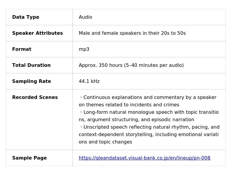 本データセットは、事件・犯罪に関する歴史的事例、制度説明、社会課題などをテーマに、話者が連続的に説明・解説する音声を収録したデータセットです。自然な話題転換や文脈依存の語り、主張整理、エピソード紹介を含む長尺のモノローグ形式で構成されており、台本に依存しない自然発話としての特性を備えています。収録時間は総計約350時間(1音声5分~40分)、20代~50代の男女話者の音声で構成しており、学習・検証データとして利用可能な44.1kHzの音声形式(mp3)で提供します。