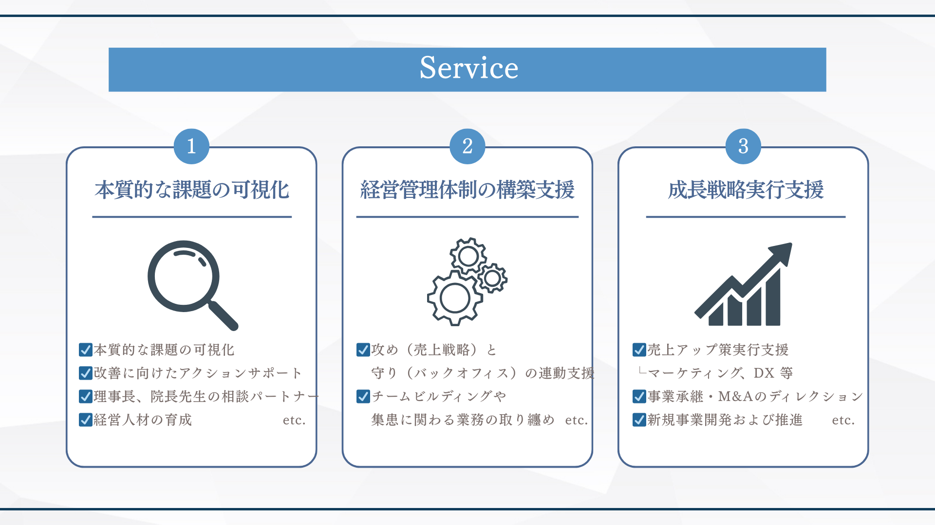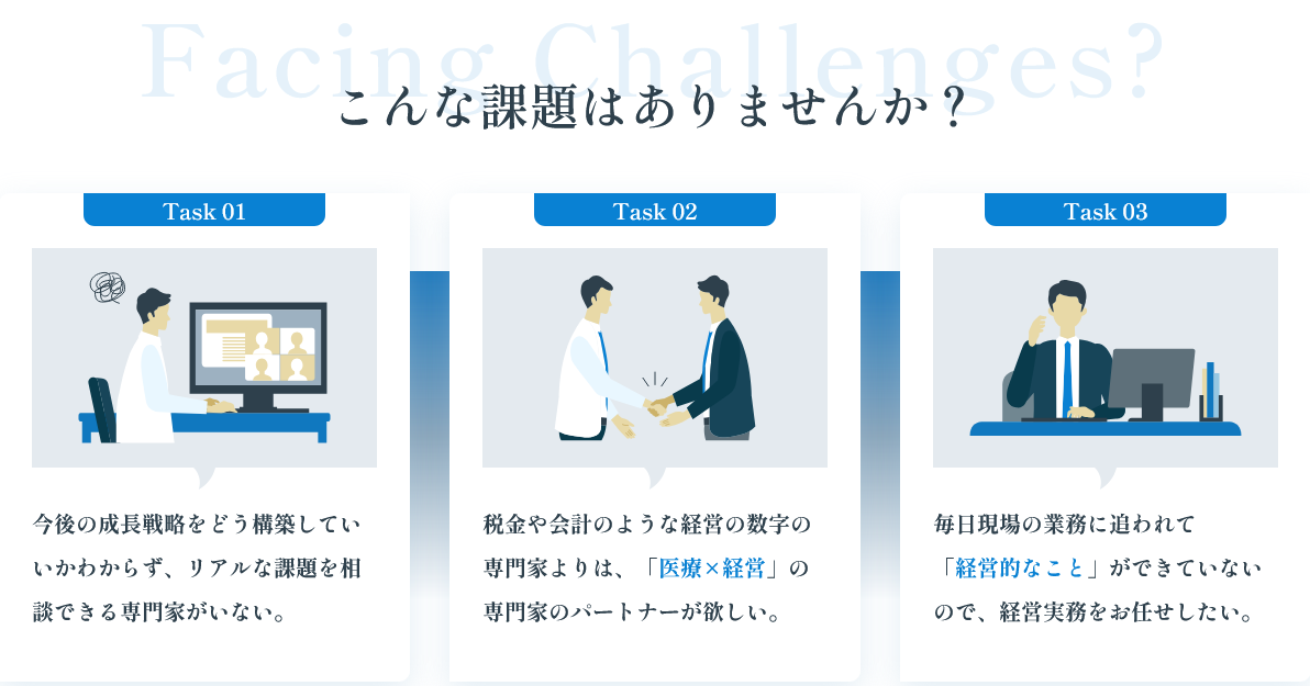 そこで当社は、院内リソースだけでは改善が困難な領域に対し、医療×経営の両面から課題解決を支援する “法人向け経営支援サービス” を提供します。