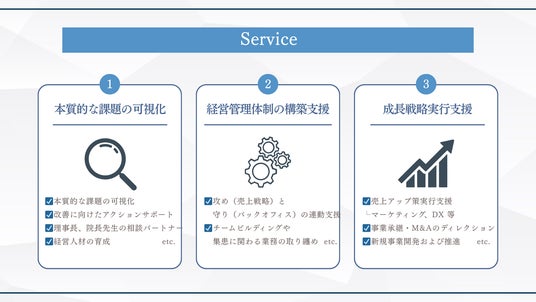 病院・クリニックやメディカル業界で事業を展開している法人の経営課題に対し、医療×経営のプロフェッショナルが現場に入り、DX・組織づくり・業務改善・PMIなどを実行するスポット型の経営支援サービスです。