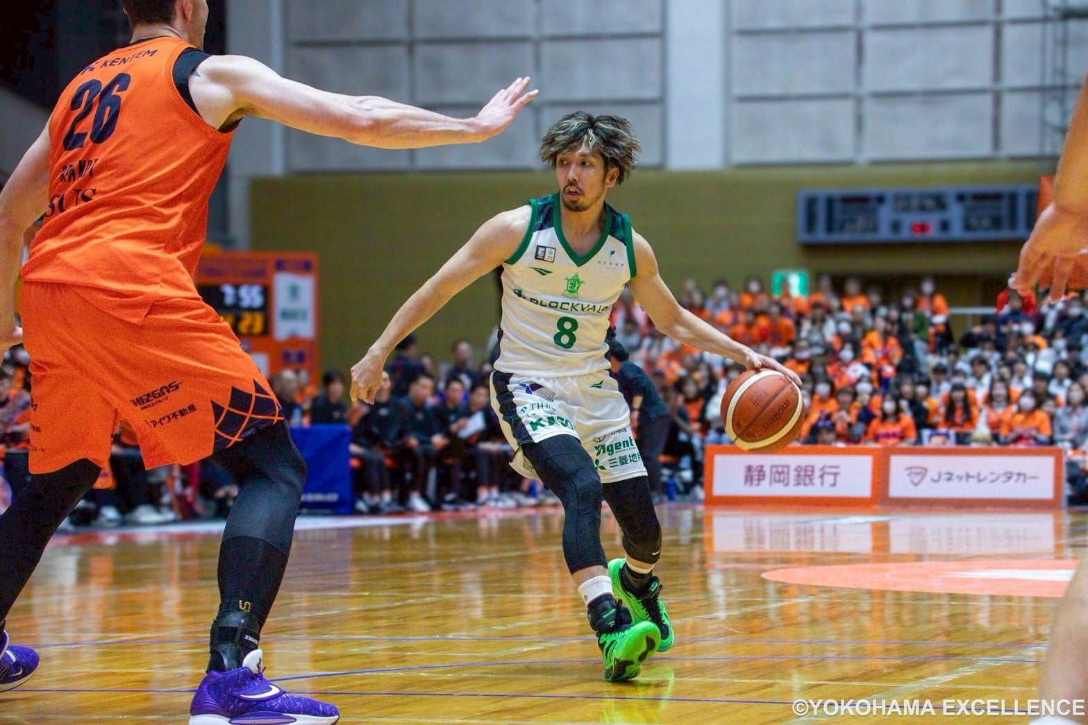 その立ち上がり、前日同様僅差の展開が続き残り3:34時点で「静岡14-14横浜EX」とどちらも譲らずにいるとその後は「静岡14-16横浜EX」、「静岡17-16横浜EX」、「静岡17-19横浜EX」、「静岡20-19横浜EX」、そして最終的には「静岡20-22横浜EX」と互いに逆転しあう展開で1Qを終えます。