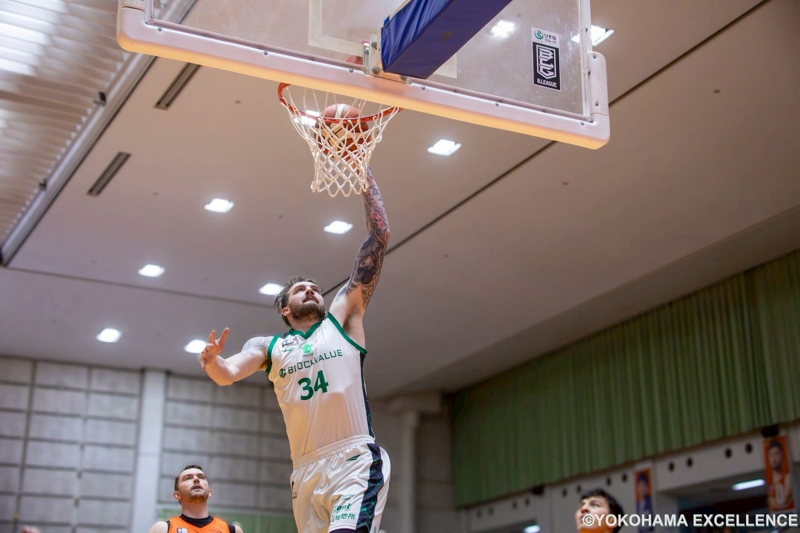 開始1:10時点で「静岡34-36横浜EX」と一気にリードを縮められるとその後は「#34 ベンジャミン・ローソン」のダンクや「#93 上良潤起」の3Pシュートなどでリードした状態を保ちます。