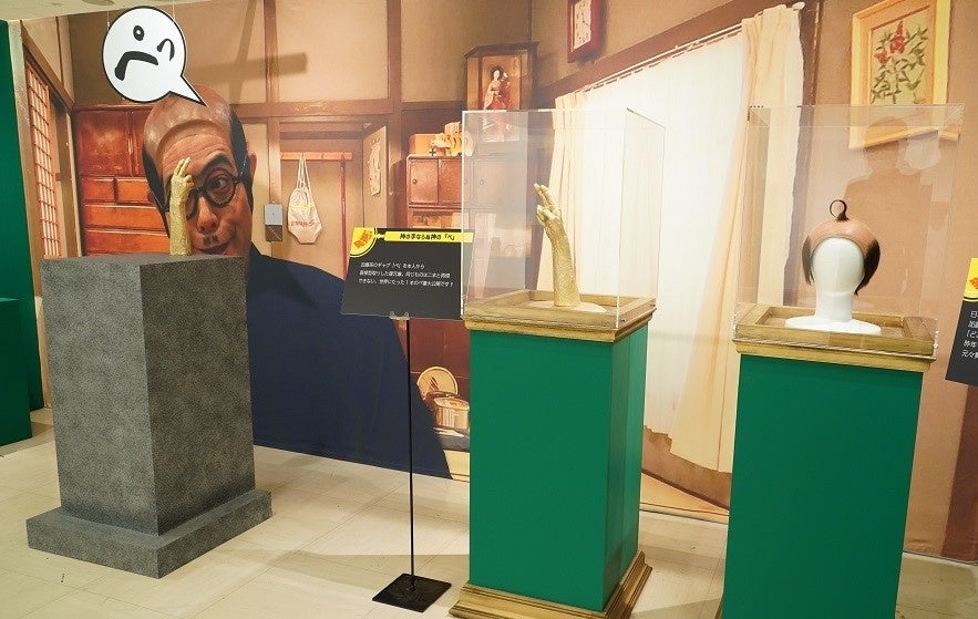 加藤茶氏の手を型どりした世界に1つの「黄金のぺ像」、実際に使用した「ハゲヅラ初号機」の展示。