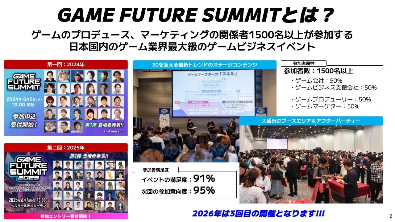 「GAME FUTURE SUMMIT」は、1500名以上のゲーム業界関係者が集うプロデュースとマーケティングをメインテーマとした、ゲーム業界最大級のビジネスイベントです。3回目の開催となる2026年は「ゲームビジネスの成功と成長のノウハウが集まる1日」として、業界をリードするキーパーソンと最新情報が集まるイベントへさらに進化をしていきます。
