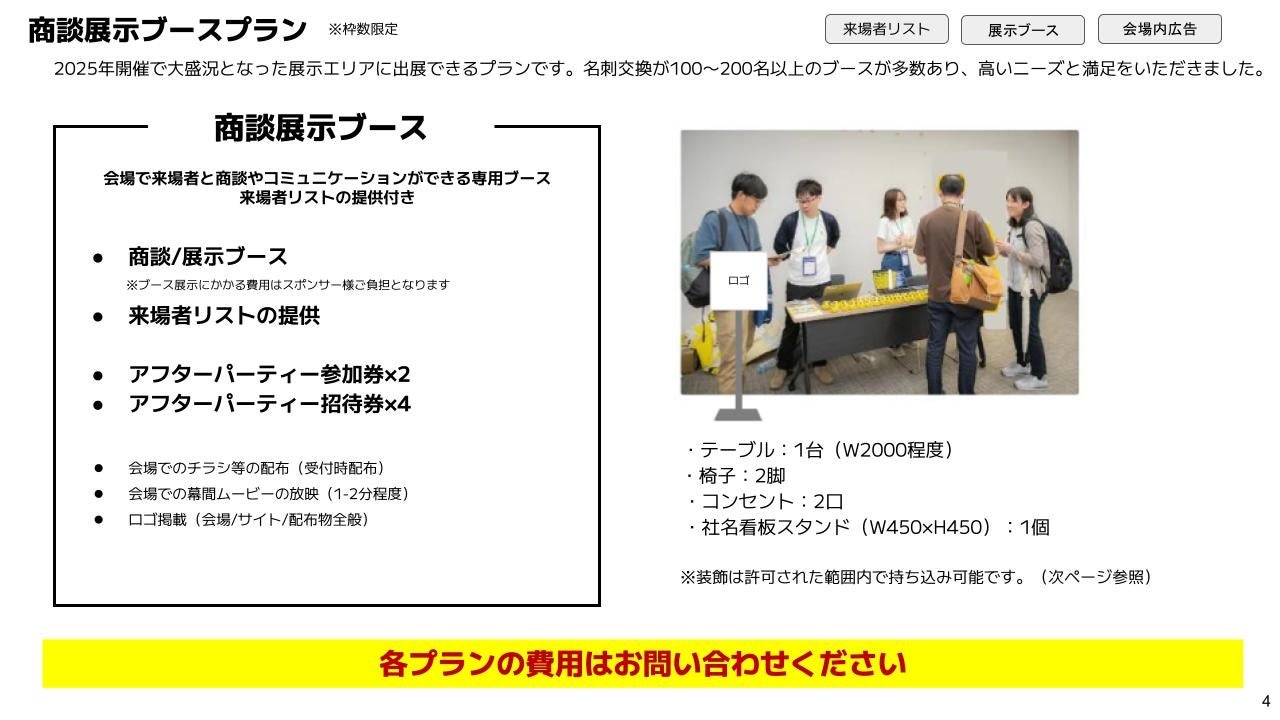 2025年開催で大盛況となった展示エリアに出展できるプランです。名刺交換が100~200名以上のブースが多数あり、高いニーズと満足をいただきました。