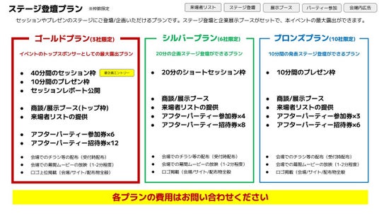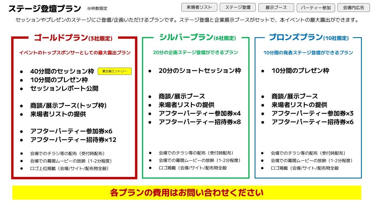 セッションやプレゼンのステージにご登壇/企画いただけるプランです。ステージ登壇と企業展示ブースがセットの枠数限定のメインスポンサープランです。