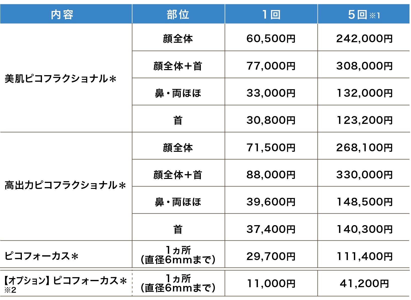 ※2 美肌ピコフラクショナルまたは高出力ピコフラクショナルと同日に施術する場合の併用限定価格。