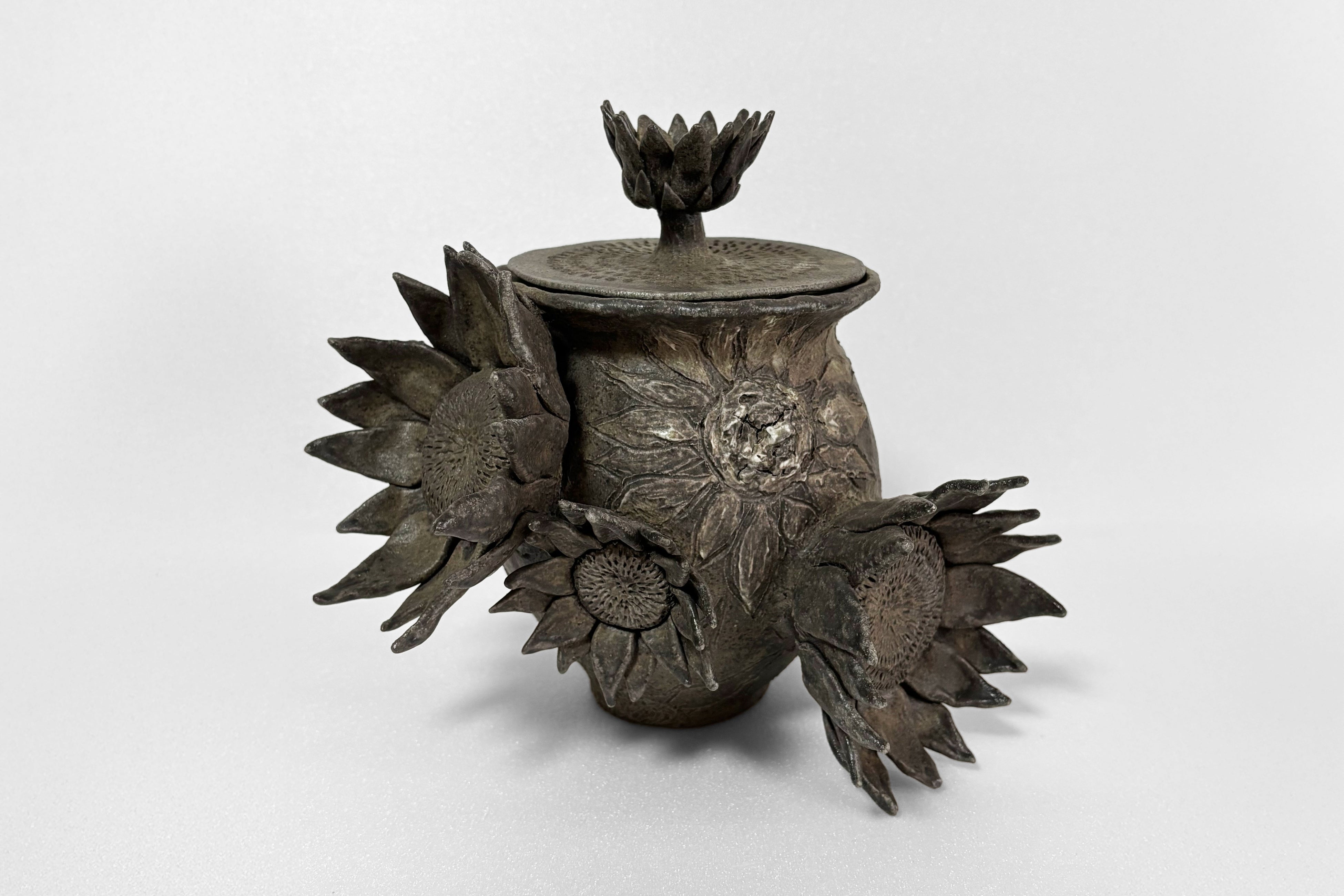 私はインスピレーションやその瞬間の感覚で作品を生み出しています。生命力のある向日葵や、地球の生命体には⽋かせない太陽などの光イメージしたものを作品に多く表現しています。 珠洲焼の自然な素材と組み合わせ、優しくも力強い何かが伝わると幸いです。