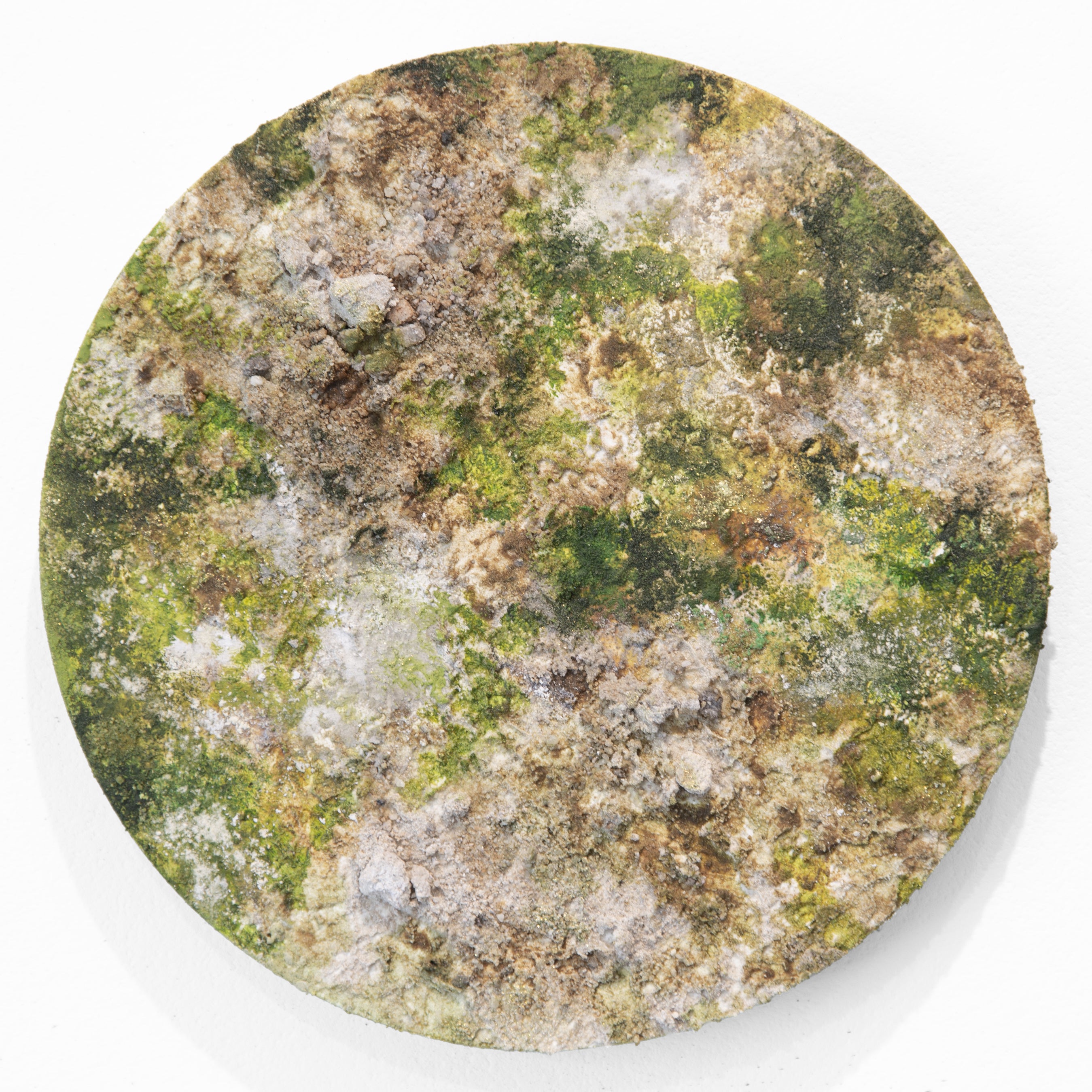 国内外各地の自然や社会史につながる土・植物・化粧原料自作した⾊材や、設置場所の光も用いることで鑑賞位置や光環境に応じて像が変位する新たな「現象」を探究している。