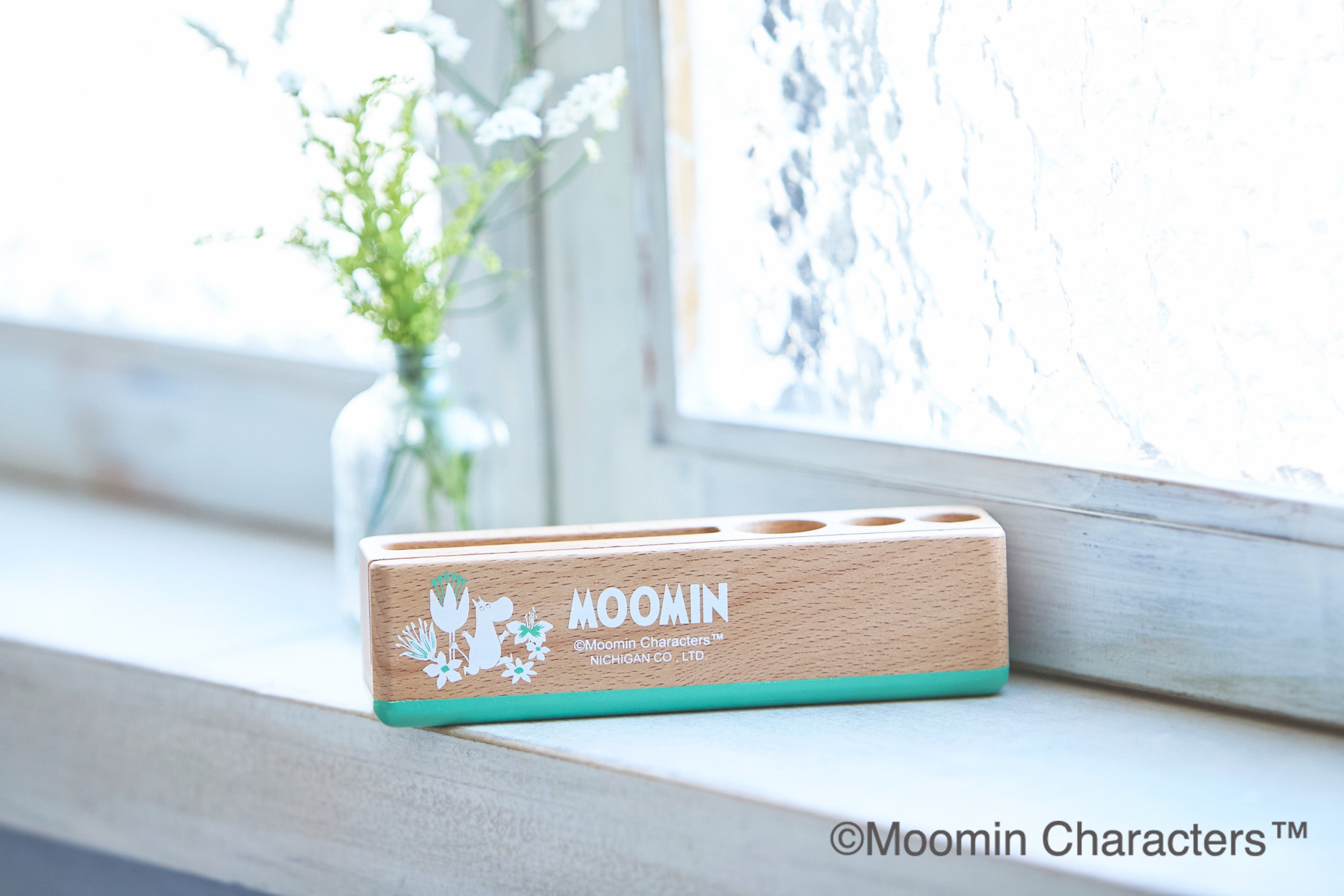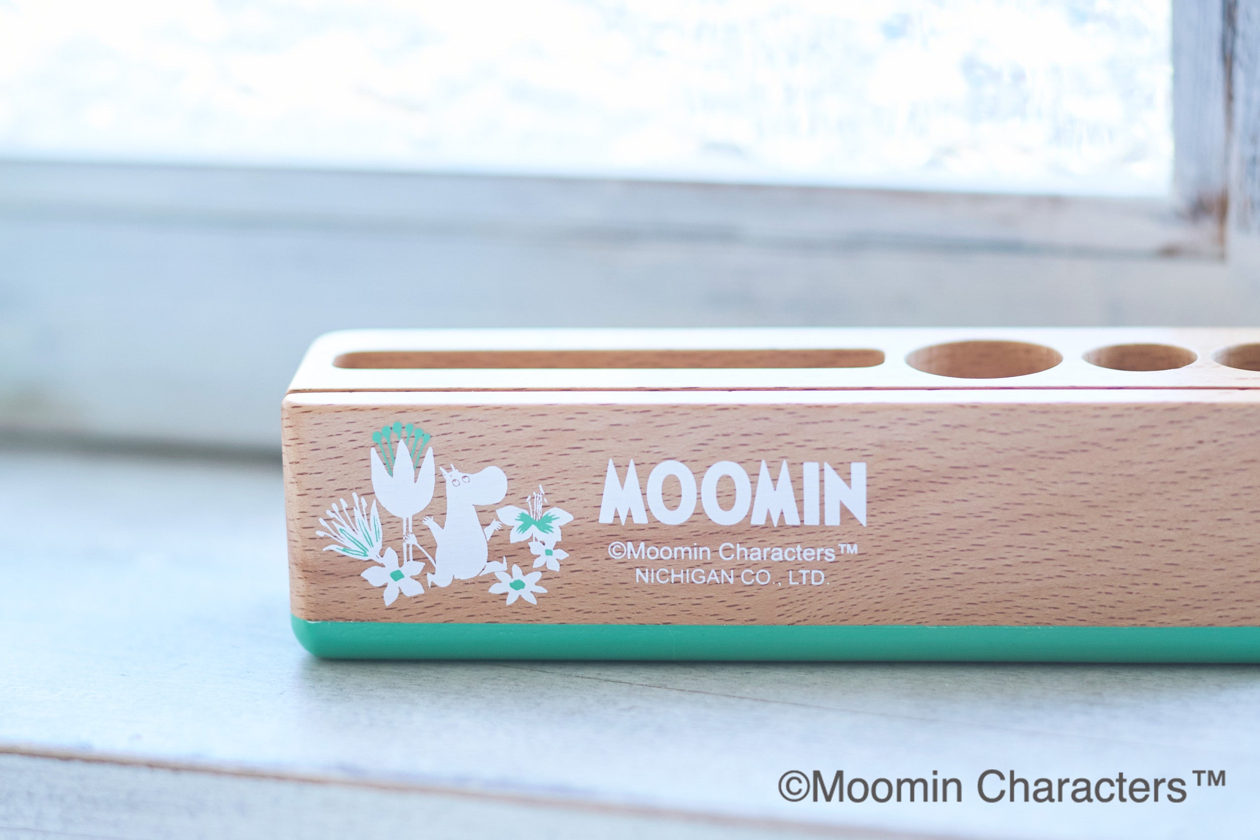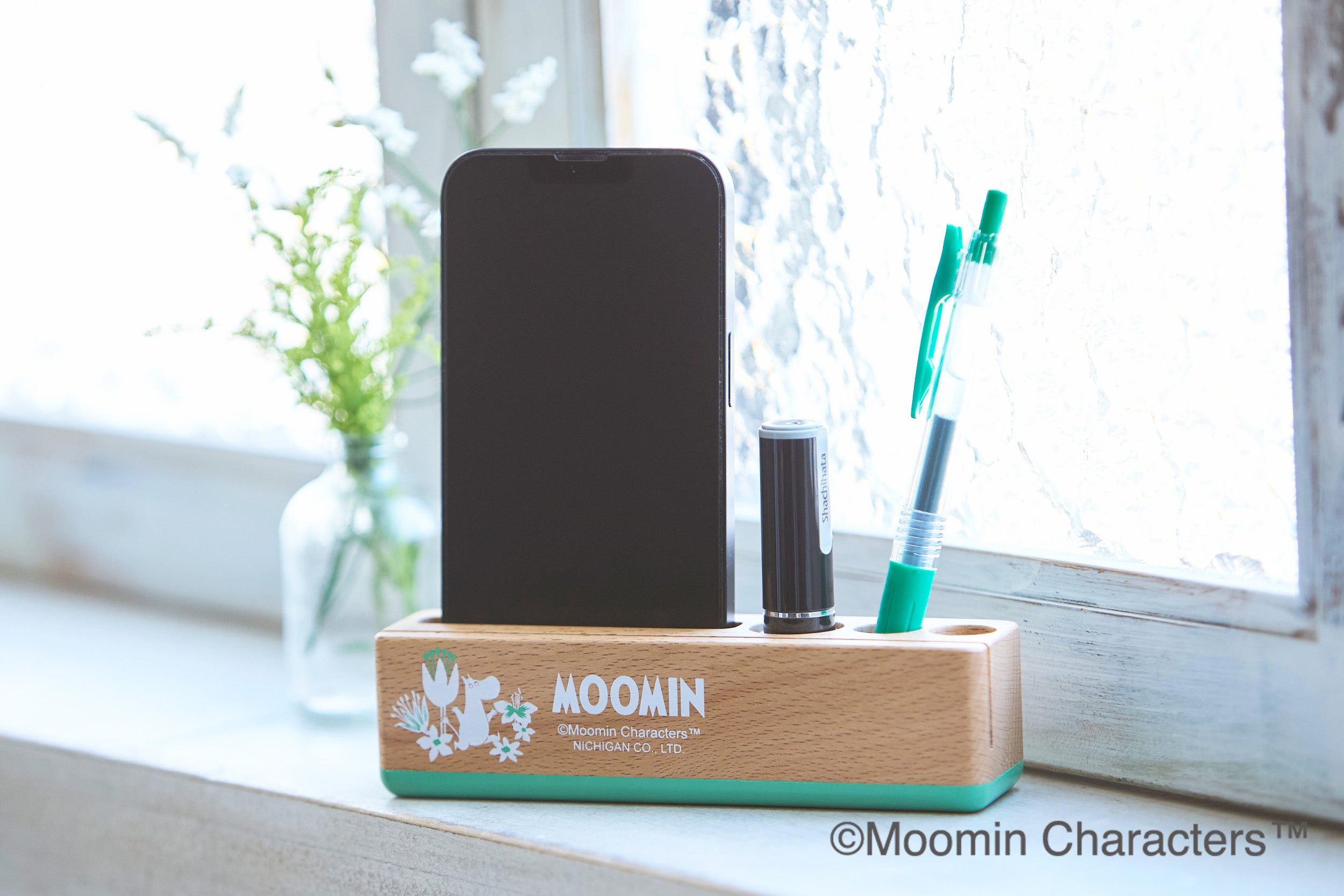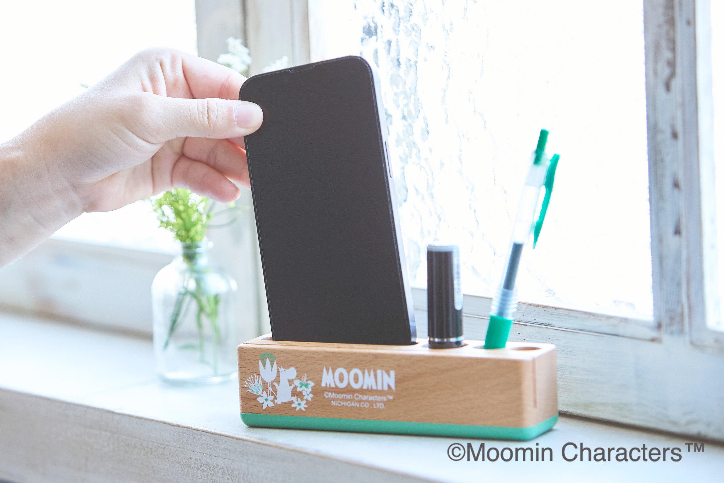 ❀かわいらしく便利に木のぬくもりにマッチしたムーミンのイラストが描かれたかわいらしいデスクスタンド。スマホ、印鑑、ペンが入ります。手前の溝にメモを入れることが出来ます。