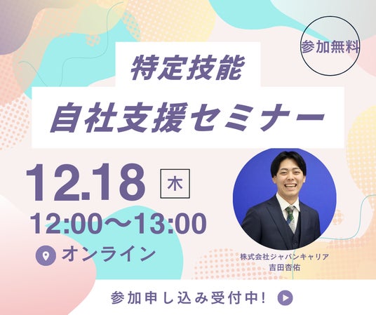 株式会社ジャパンキャリアは、特定技能における自社支援(=支援委託を行わず企業が自社で支援を実施する方式)について、制度の全体像・導入メリットを整理して解説するセミナーを開催します。