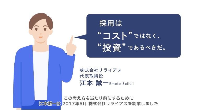 創業の思想を表現(0:37~): 人材不足という社会課題、そして多くの企業が採用を「コスト」として扱う現状に対し、「採用はコストではなく投資であるべき」という創業の想いを語ります。