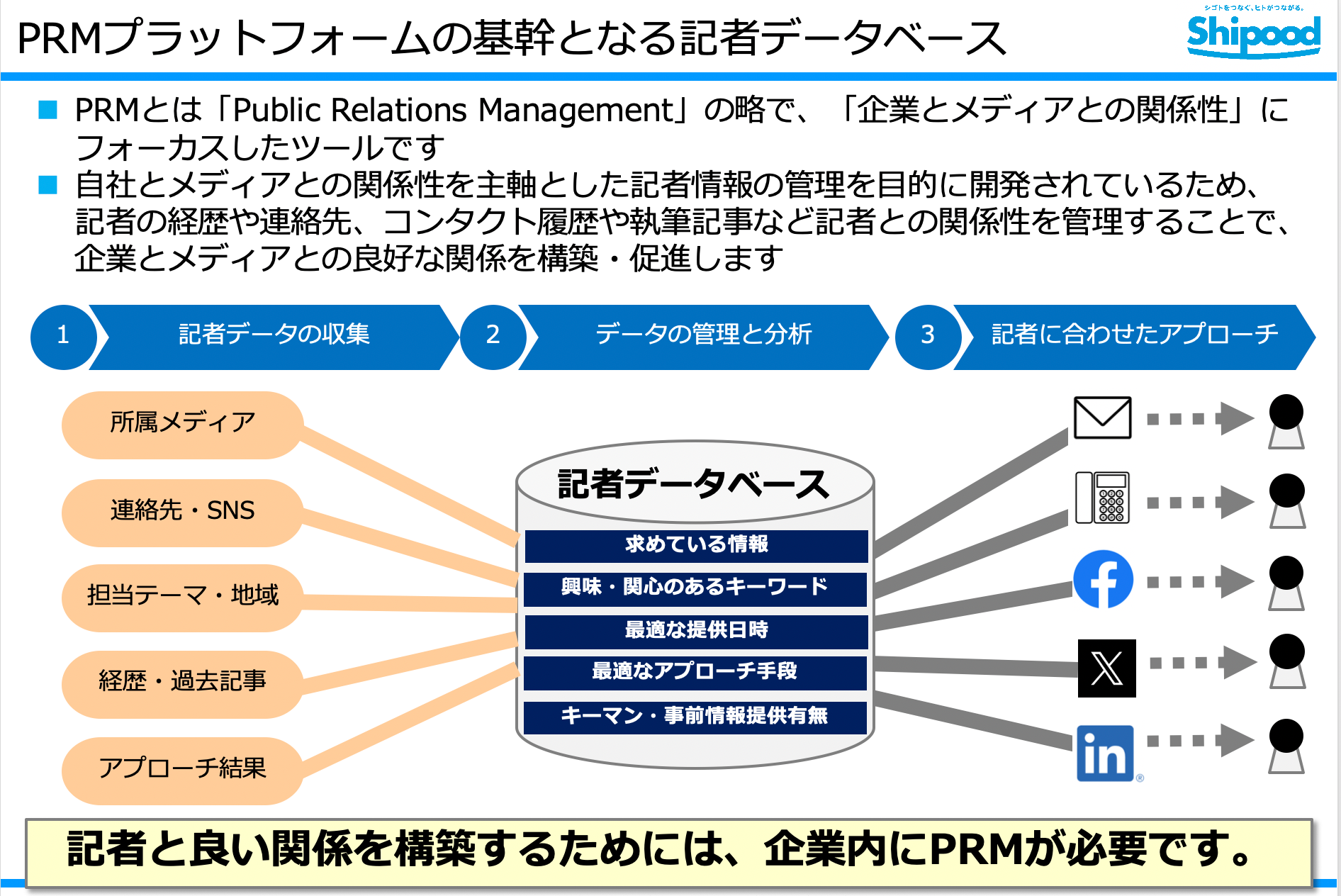 企業のメディアリレーションを強化するために開発されたクラウド型のメディア管理システムです。Public Relations Management(パブリック リレーションズ マネジメント)の略で、ITテクノロジーを活用し、記者の経歴、連絡先、所属部署、担当業界、執筆記事、コンタクト履歴などのデータを一元的に蓄積し、自社とメディアの関係性を“資産”として管理する仕組みを指します。