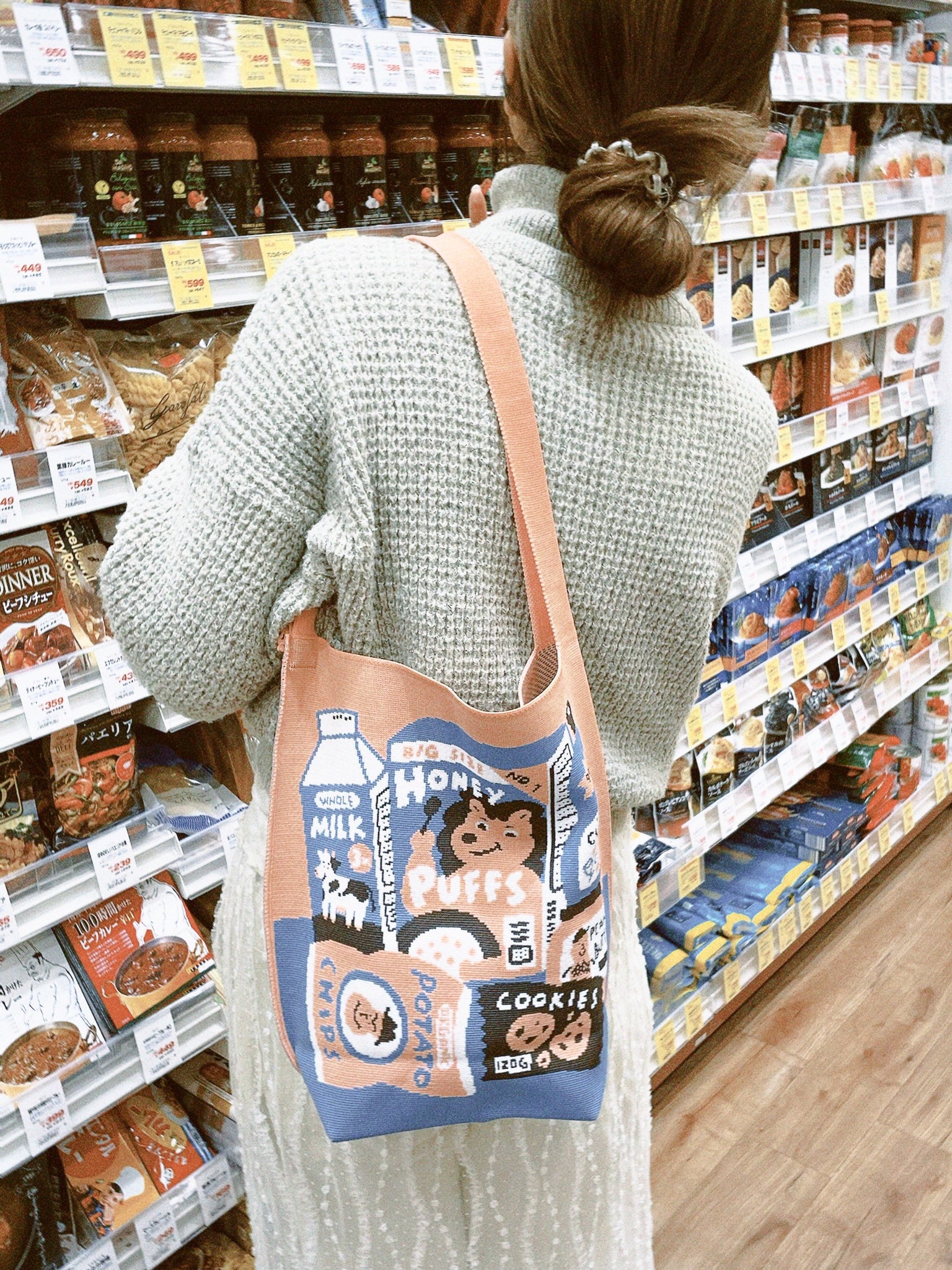 シリアルやミルク、ポテトチップス、クッキーなどのモチーフが並び、“スーパーマーケット”を思わせるポップで遊び心あふれるデザインに仕上がっています。