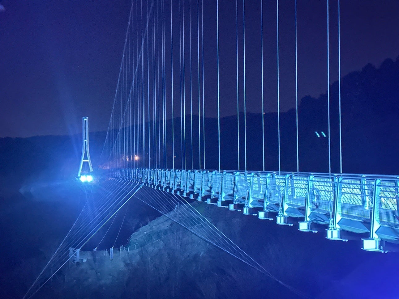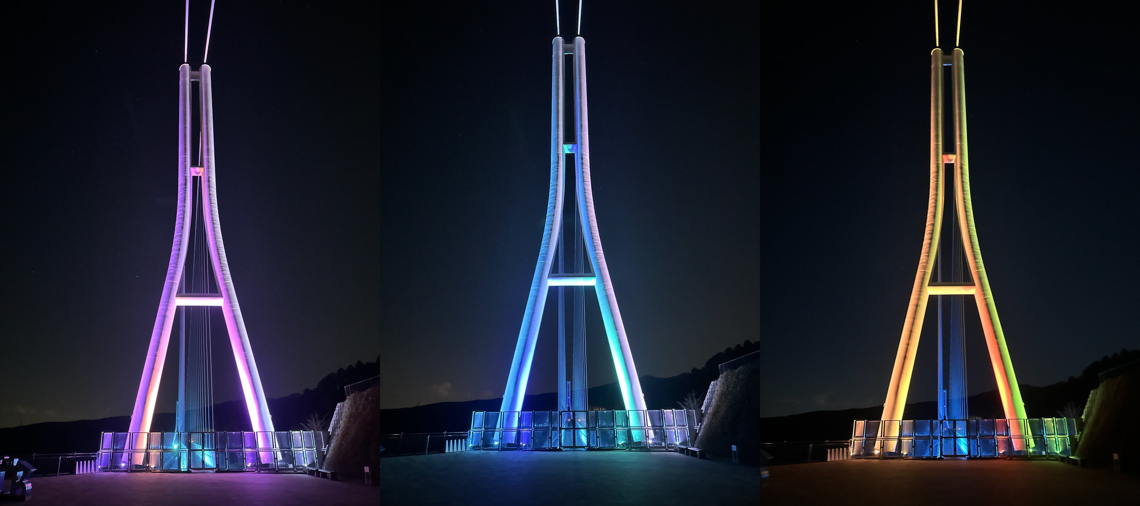吊橋の主塔と高欄(手すりや柵の部分)のライトアップをリニューアルします。6つのライトアップパターンで照らされる特別な空間をお楽しみいただけます。このライトアップは、年間を通して2か月ごとに季節に合わせてテーマカラーとライトアップパターンが変化します。2025年12月から2026年1月は、三島スカイウォークの象徴とも言える、空や富士山、駿河湾をイメージしたスカイブルーをメインに光ります。