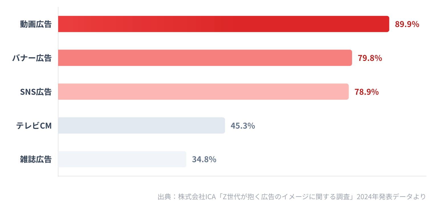 2024年に公開されたZ世代(18歳~27歳)を対象とした意識調査によると”89.9%”ものユーザーが動画広告を「不快」と感じていることが明らかになりました。
