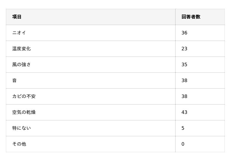 - 睡眠時のエアコン使用で最も気になるのは「空気の乾燥」であり、次いで「音」「カビの不安」が多くなっている。