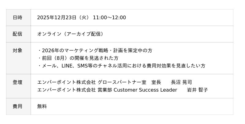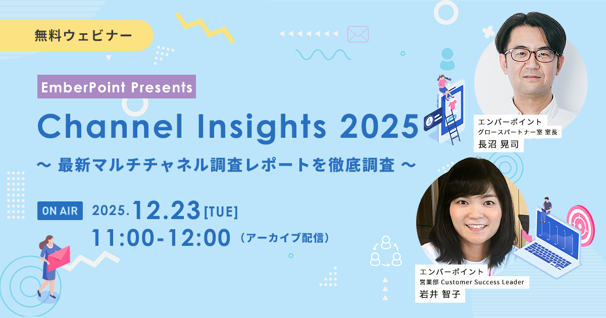 エンバーポイント株式会社(本社:東京都千代田区、代表取締役:五十嵐 真人、以下エンバーポイント)は、2025年12月23日(火)11時00分に、オンラインセミナー「Channel Insights 2025 ~最新マルチチャネル調査レポートを徹底調査~」のアーカイブ配信を実施します。本セミナーは、2025年8月に開催し、多くの反響をいただいたものです。