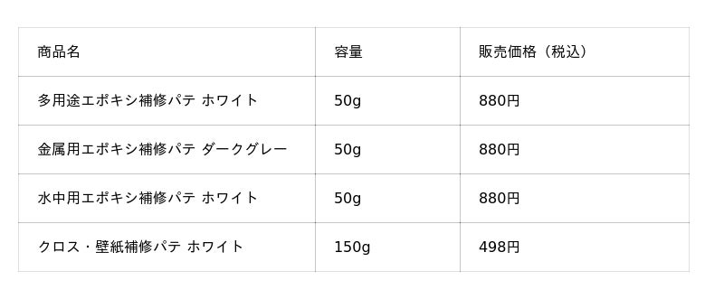 こうした声を受け、“納得感”や“安心感”、“選びやすさ”を重視した接着剤・補修材を新たに開発いたしました。商品は(1)接着剤、(2)補修用パテ、(3)防水・補修用シーリング材、(4)補修用防水テープの4つのカテゴリから、計12商品をラインアップいたしました。