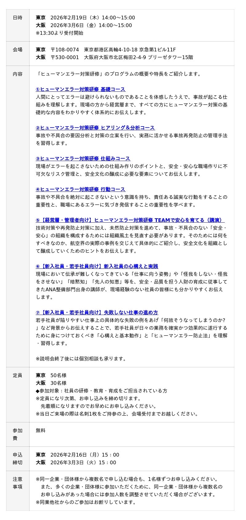 今回の説明会では、ANA整備部門のノウハウを凝縮した「ヒューマンエラー対策」の各研修プログラムをご紹介いたします(詳細は下記をご参照ください)。当日は実際に「ヒューマンエラー対策研修」に登壇している講師からのプログラム説明に加えて、ワークやクイズも体感していただけます。