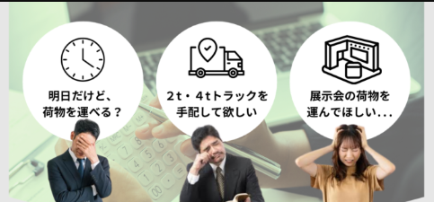 「明日、都内発着の荷物を運びたい」「2t・4tのトラックを手配してほしい」「展示会・イベント会場へ搬入出する荷物を運んでほしい」…。そんな場面で活用いただけるLINE配車サービスです。