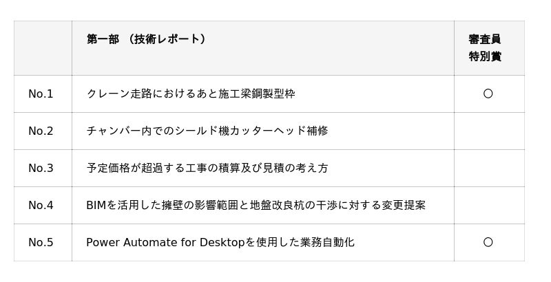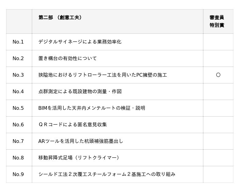 現場や設計・施工における技術的課題の解決や新しい工法の提案など、専門性の高い取り組みを発表