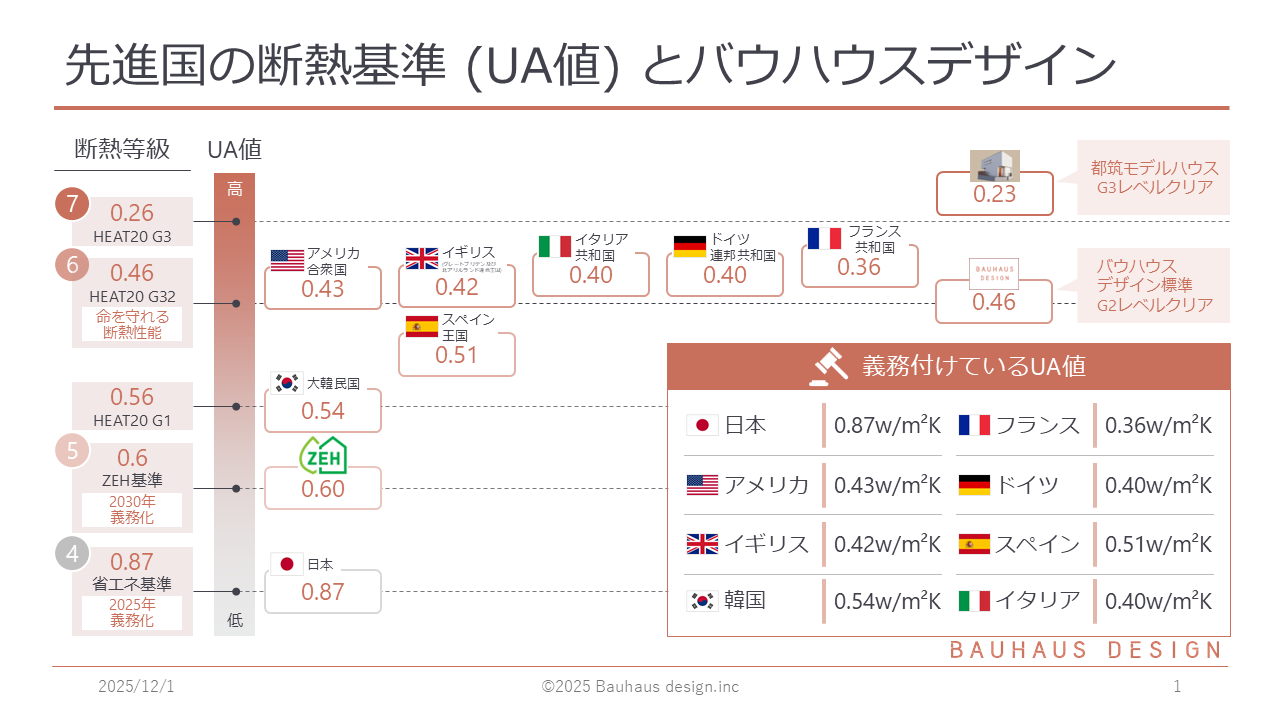 先進国各国の断熱基準(UA値) 断熱等級6以上が“生命を守れる基準“と言われている