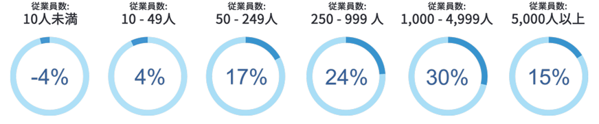 日本国内の組織規模別調査では、「従業員数:10人未満」を除く5つの組織規模で増員予定でした。「従業員数:1,000-4,999人」の組織が、前四半期比+5ポイントで純雇用予測+30%となり、最も高い雇用予測です。