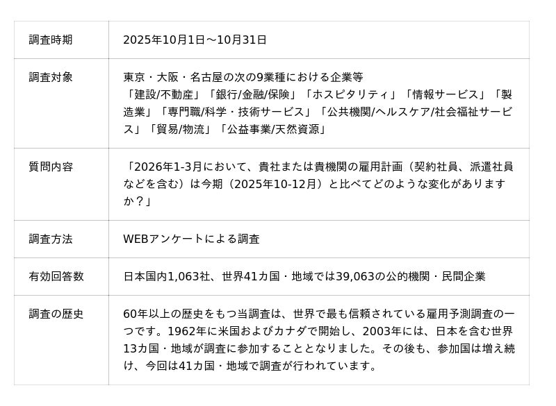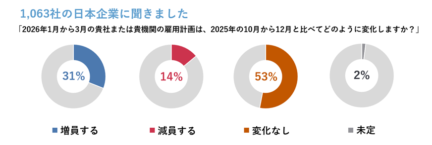 総合人材サービスのマンパワーグループ株式会社(本社・東京都港区、代表取締役社長:池田 匡弥、以下マンパワーグループ)は、2026年第1四半期(1-3月期)における企業の雇用計画を尋ねた「マンパワーグループ雇用予測調査」の結果を発表します。調査結果は「2026年1-3月において、貴社または貴機関の雇用計画(契約社員、派遣社員等を含む)は今期(2025年10-12月)と比べてどのような変化がありますか?」という質問に基づいています。なお、本調査はマンパワーグループが四半期ごとに行っている世界で最も広範囲(実施対象:41カ国・地域)にわたる事前調査です。