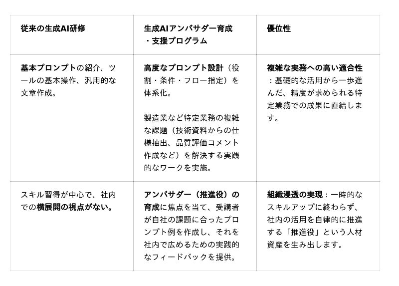 当社の「生成AIアンバサダー研修」は、従来の「ツールの基本操作」に終始する研修とは異なり、実務で成果を出すための「高度なプロンプト設計」と「社内啓発・推進」のノウハウ習得に特化しています。