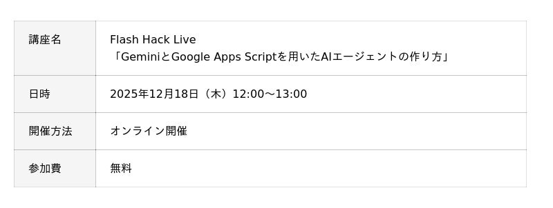 生成AI×GASで仕事を自動化する時代へ -「AIエージェントの作り方」12/18 (木) 無料開催
