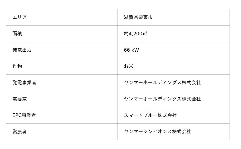 スマートブルー株式会社(本社:静岡県静岡市葵区、代表取締役:塩原太一郎、以下当社)は、ヤンマーホールディングス株式会社(本社:大阪府大阪市北区、代表取締役社長:山岡健人、以下ヤンマーホールディングス)から、滋賀県栗東市での営農型太陽光発電建設工事を受注したことをお知らせいたします。
