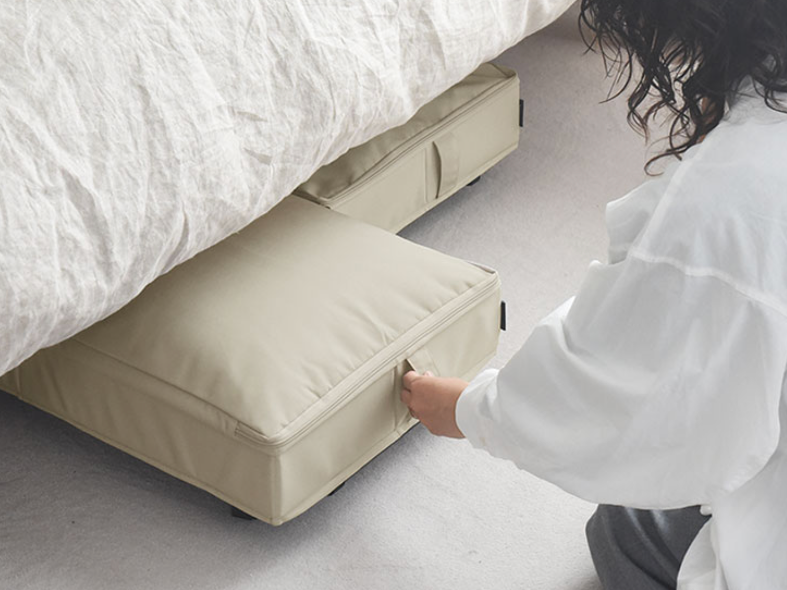 デッドスペースになりがちなベッド下に、すっきり収められる絶妙サイズ。キャスター付きで出し入れもしやすく、「しまう」も「取り出す」もスムーズにできるデザインです。