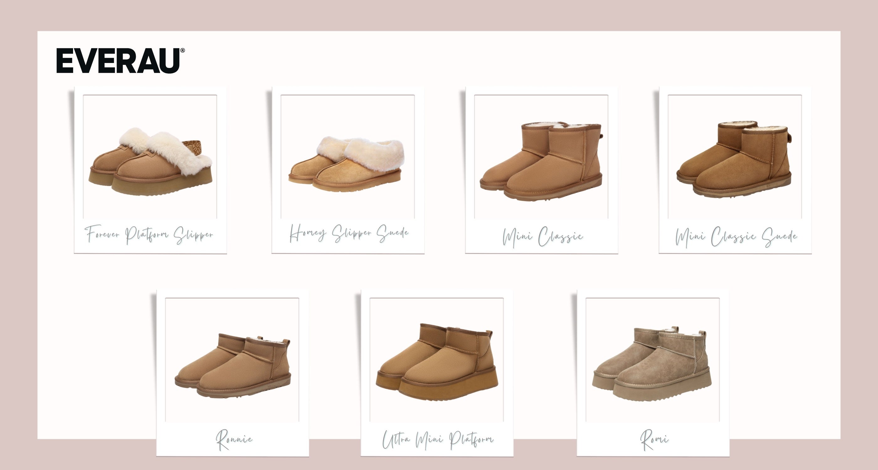 商品はEVERAUを象徴する6つのモデルが登場。クラシックなブーツからリラックス感のあるスリッパ、スタイルアップを叶えるプラットフォームまで、幅広いラインナップで日常のさまざまなシーンに寄り添います。