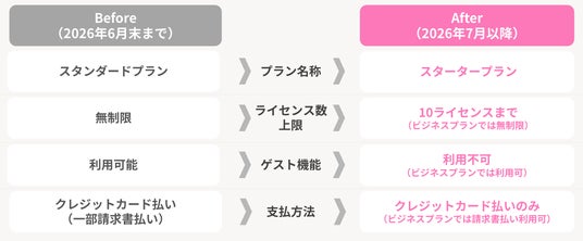 2026年7月1日(水)より、新たにスタータープランの提供を開始いたします。基本的な機能や利用料金は従来のスタンダードプラン内容を継承しますが、以下の点が異なります。