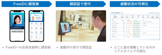 今回、防災体験会への顔認証IDプラットフォーム「FreeiD」導入において、顔認証受付による時間短縮だけでなく、ダッシュボードを用いたリアルタイムでの避難情報の可視化を可能にすることで、情報 管理の利便性向上につなげるべく実証提供にいたりました。