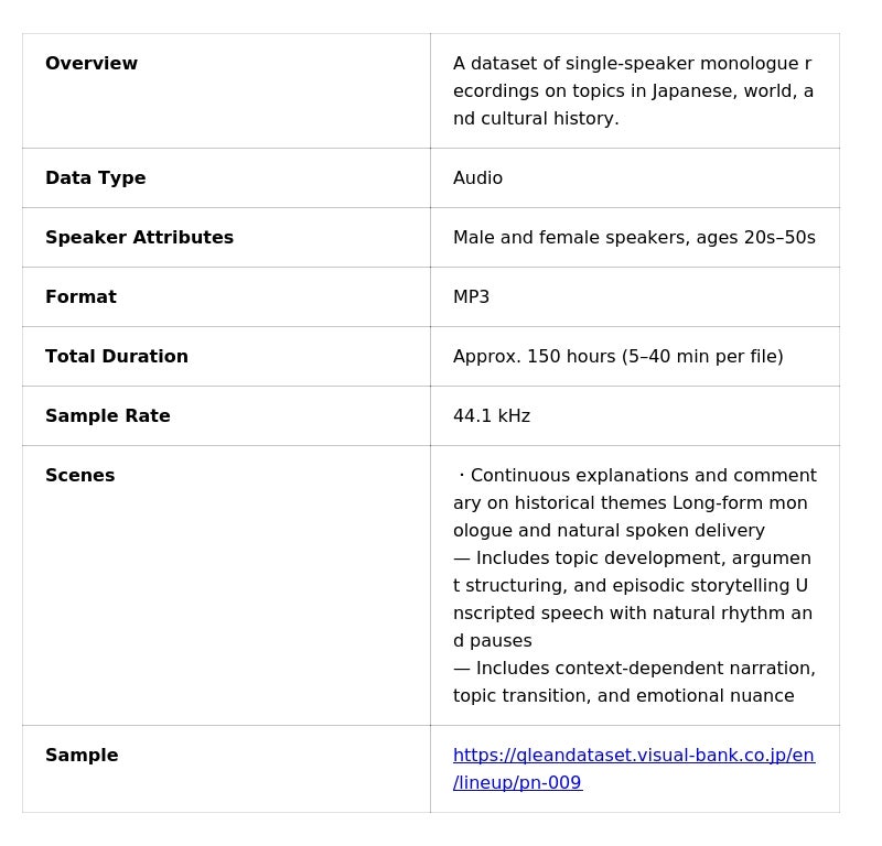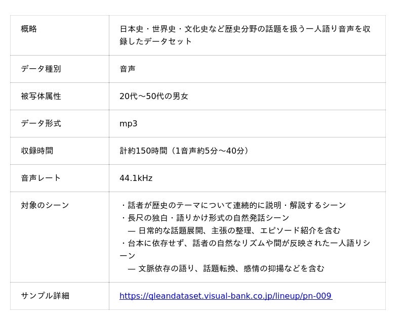 Visual Bank株式会社(東京都港区、代表取締役CEO 永井真之、以下「Visual Bank」)は、傘下の株式会社アマナイメージズを通じて展開するAI学習用データソリューション『Qlean Dataset(キュリンデータセット)』において、『日本語・1話者・歴史テーマトーク音声コーパスデータセット』の提供を開始しました。本データセットは、日本史・世界史・文化史などの歴史分野を題材とした一人語りの音声を収録しており、音声認識(ASR)、自然言語処理(NLP)、生成AI基盤モデルの学習・評価に活用できます。