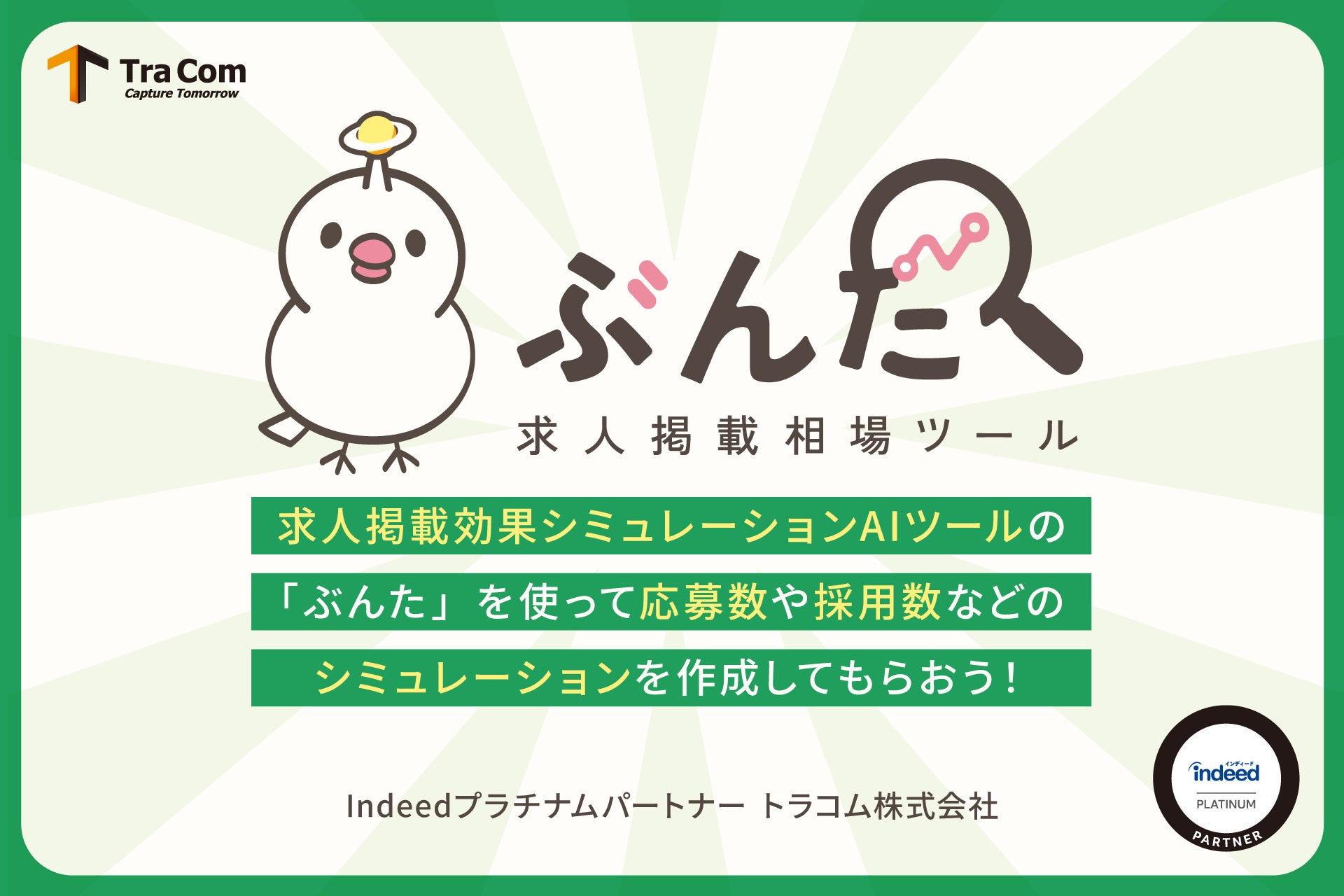 トラコム株式会社(Indeedプラチナムパートナー)は、求人広告の運用データをもとに応募数や採用コストを予測するAIツール『ぶんた』をリリースしました。ぶんたは無料・回数制限なくご利用いただけます。
