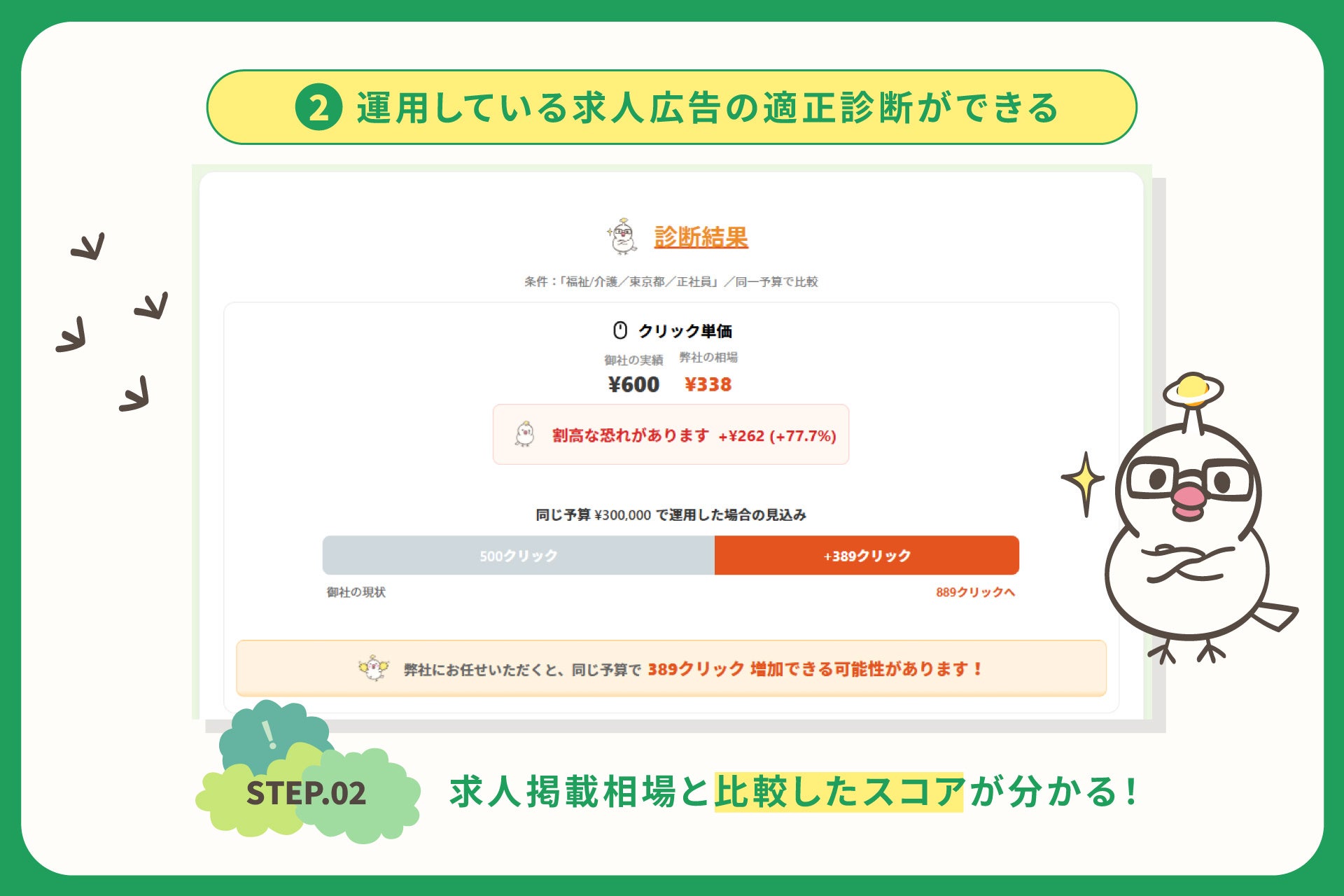 現在求人広告を運用されている企業様向けに、運用中の求人広告のスコアを用いて応募数や採用コストの適正診断を行えます。