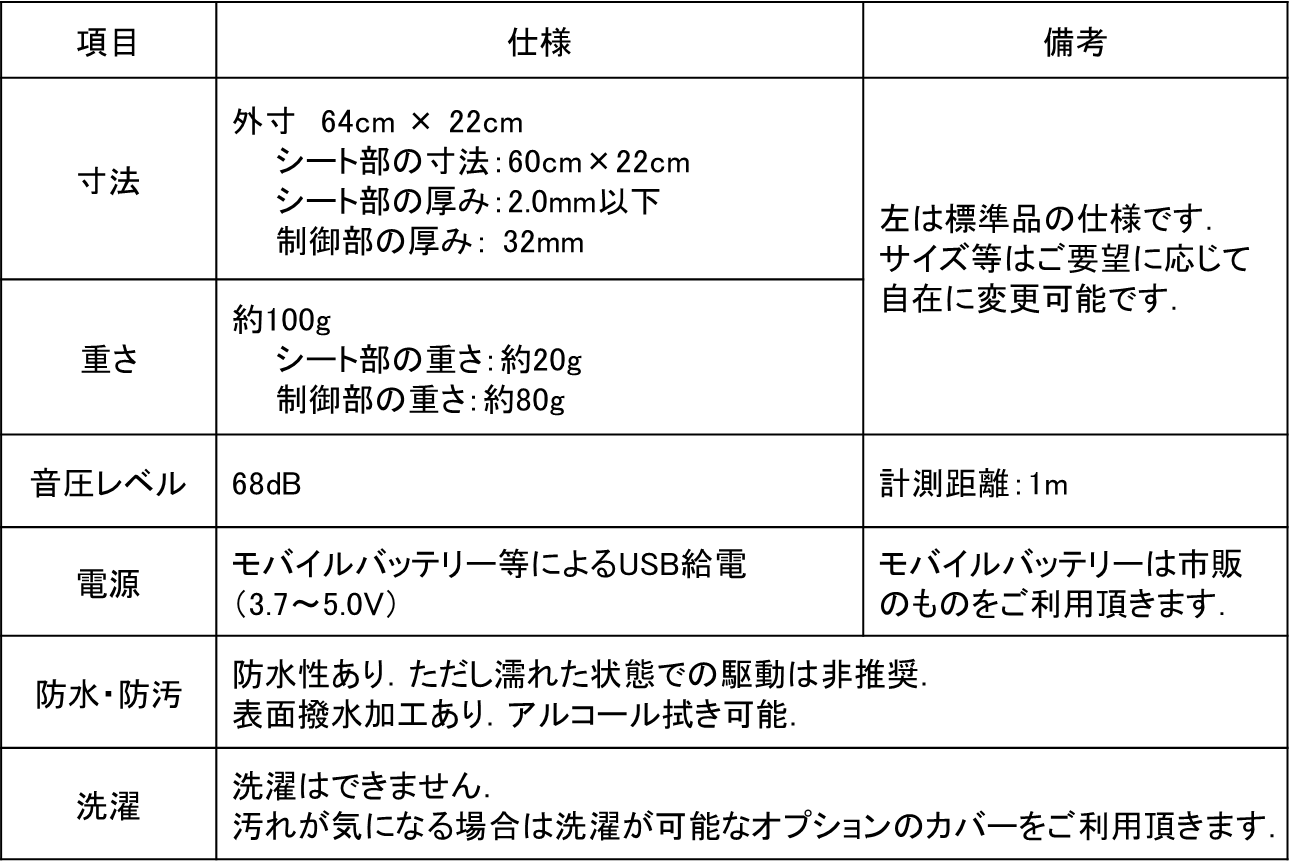 センシアテクノロジーでは、実用化に向けて製造技術の確立や駆動回路の小型化を進めてまいりました。このたび、携帯可能な布状スピーカーである 「ファブリックスピーカー・ポータブル」 の開発に成功し、以下の仕様を達成いたしました。